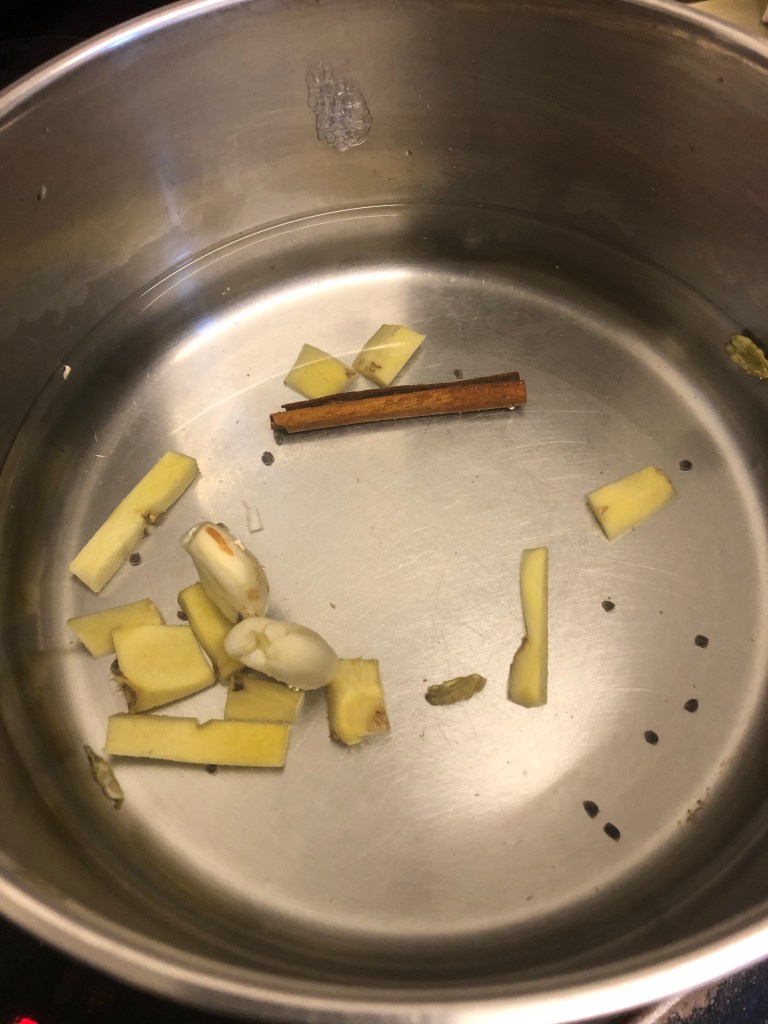 Method – Add to a large pan over high heat the cardamom pods, garlic, ginger, cinnamon stick and 1 litre of water bringing it to the boil.