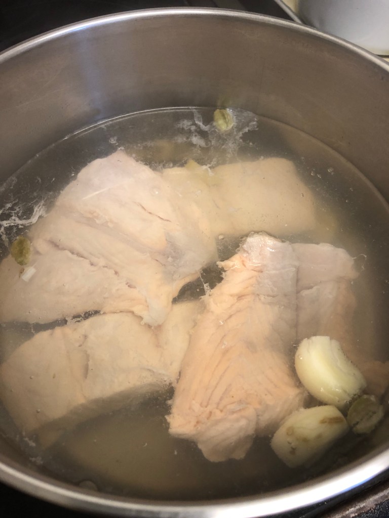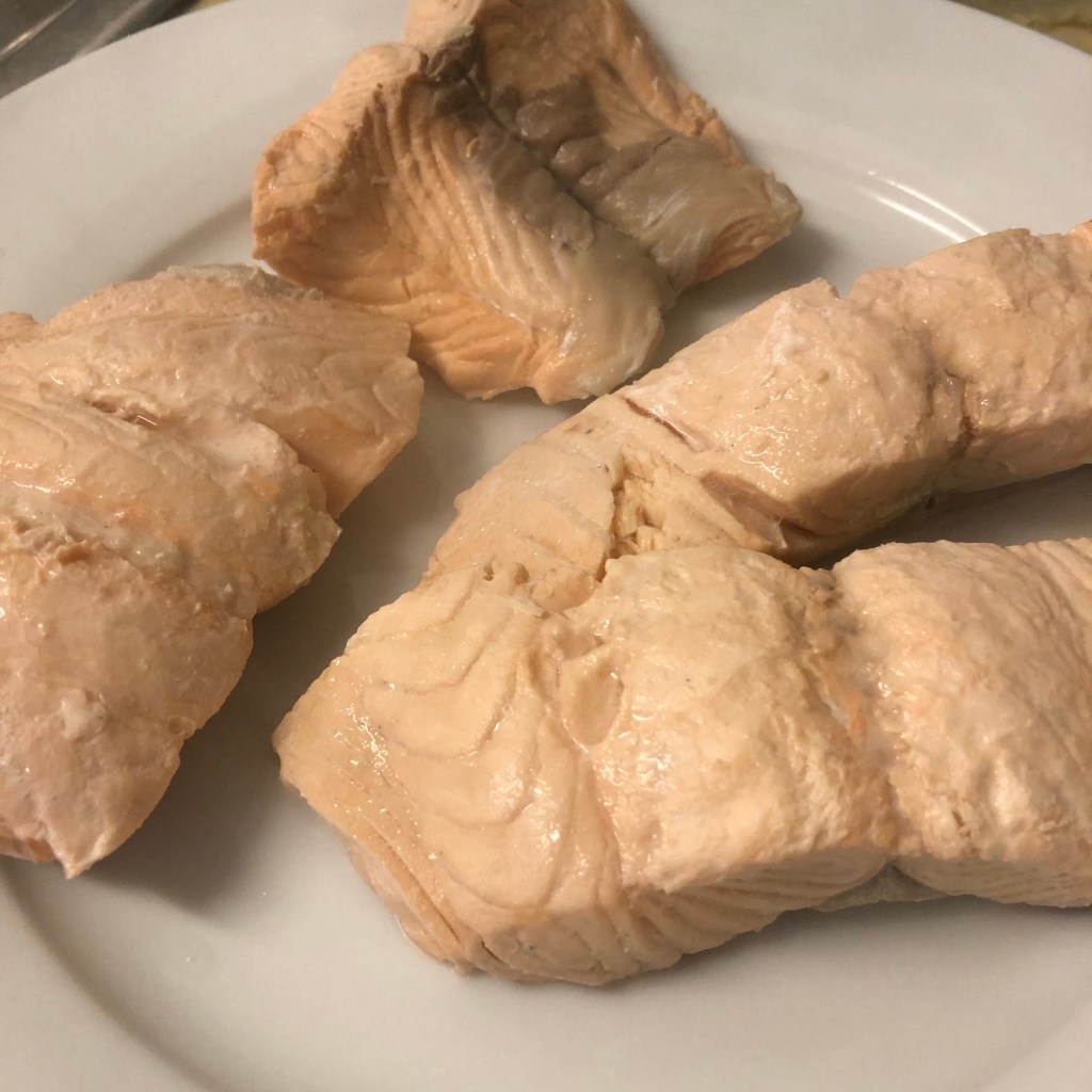 Once the water is boiling gently lower in your salmon fillets lowering the temperature a little allowing them to simmer for 5 minutes.