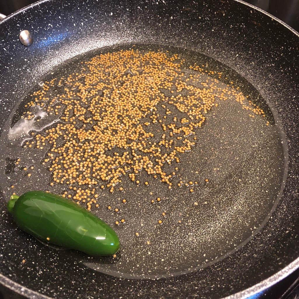 In a heavy based pan heat the vegetable oil. When it’s hot add the pierced pepper & mustard seeds.