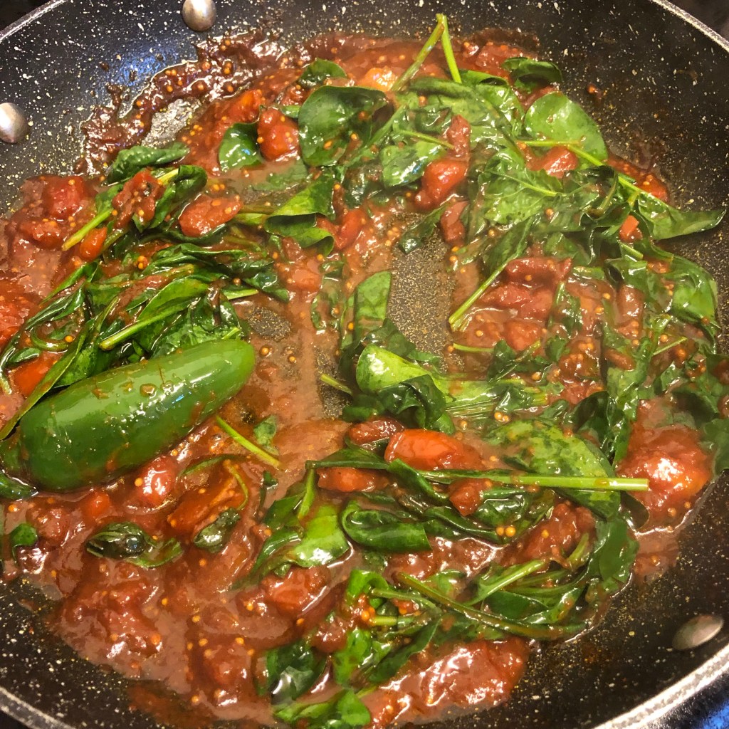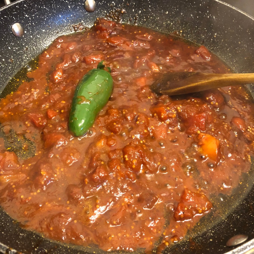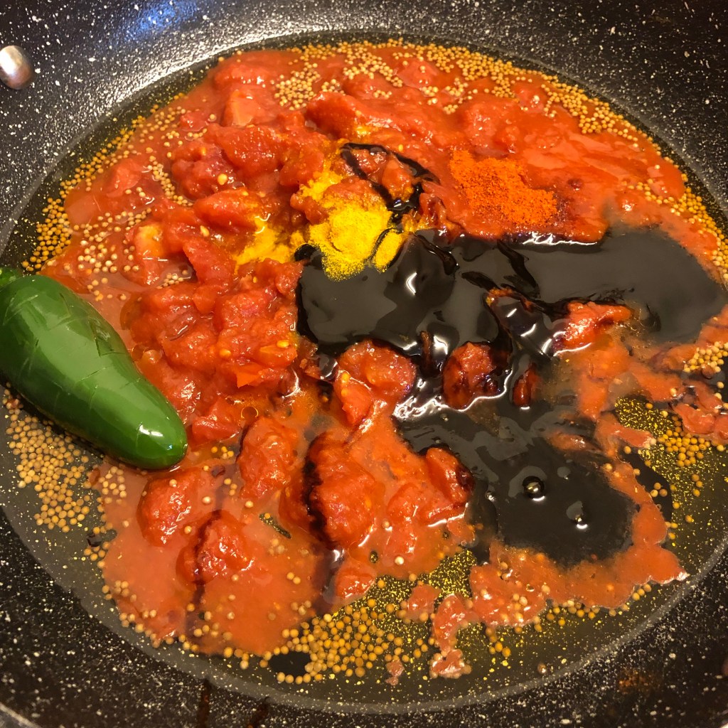 As the mustard seeds brown and pop add in the chopped tomatoes, turmeric chilli powder & black treacle lowering the temperature then cooking for another 5 minutes.
