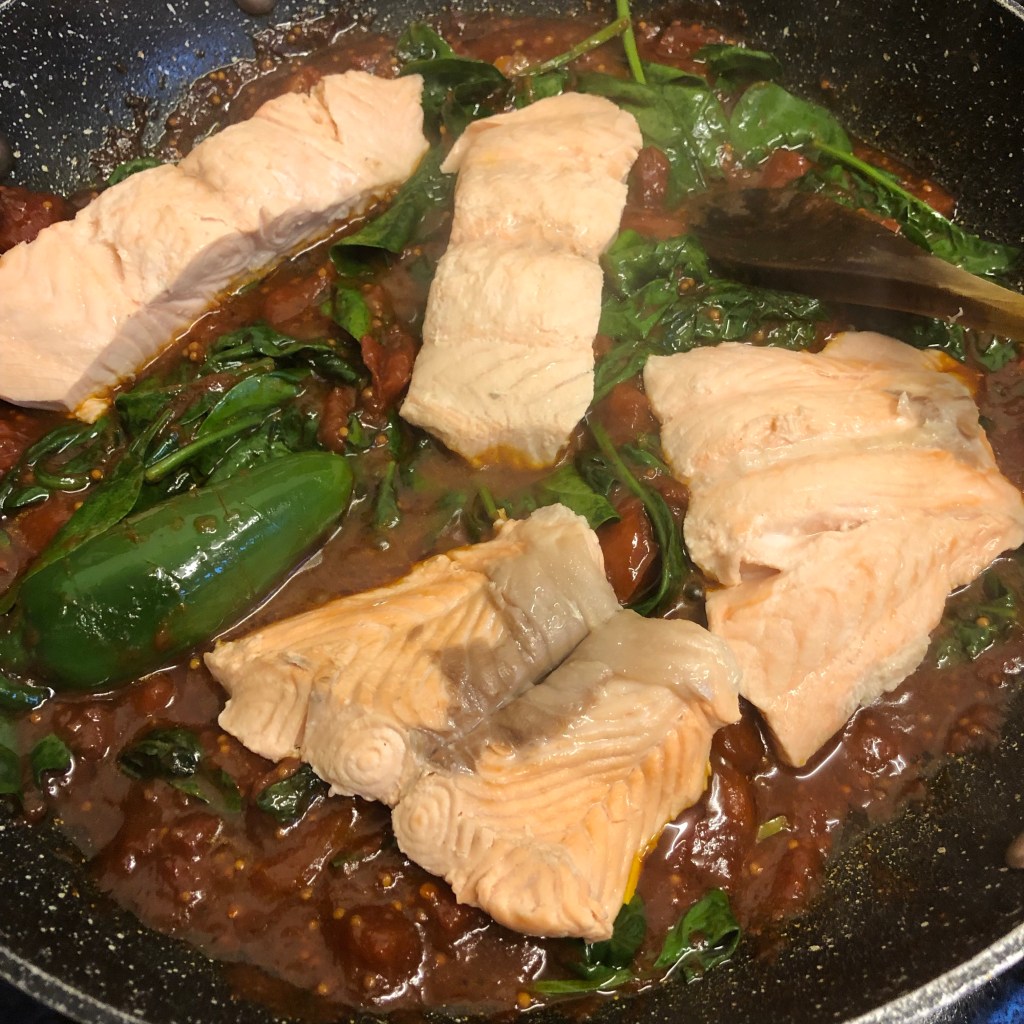 Ensure the salmon is covered with the amazing sauce but don’t stir it as the salmon will break down, leave it to do its magic.