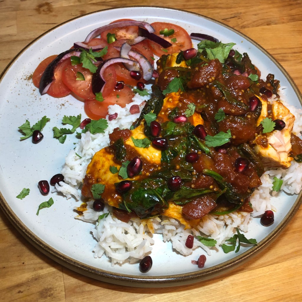 To serve added the chopped coriander and pomegranate seeds. Also I served mine with a fresh tomato salad made up with chopped tomatoes, a little red onion, 1/2 a diced green chilli, sprinkle of garam masala and salt over the top along with the juice of the other half of lemon 🍋 plus steamed rice.