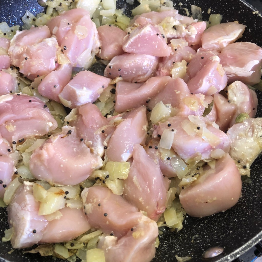 Next, add the curry leaves, cardamom pods and chicken cooking for a further 5 minutes.