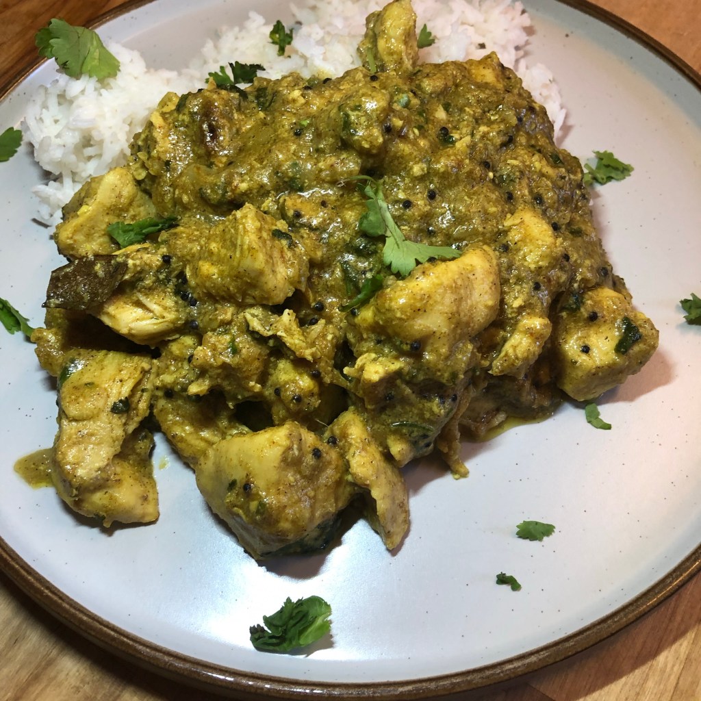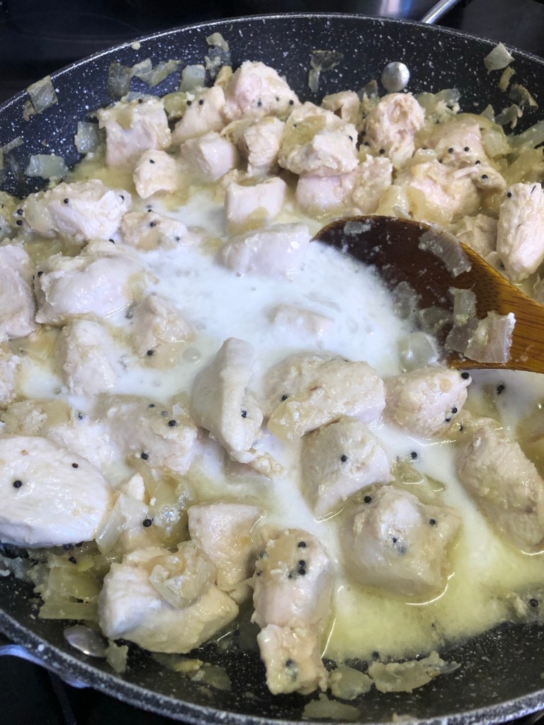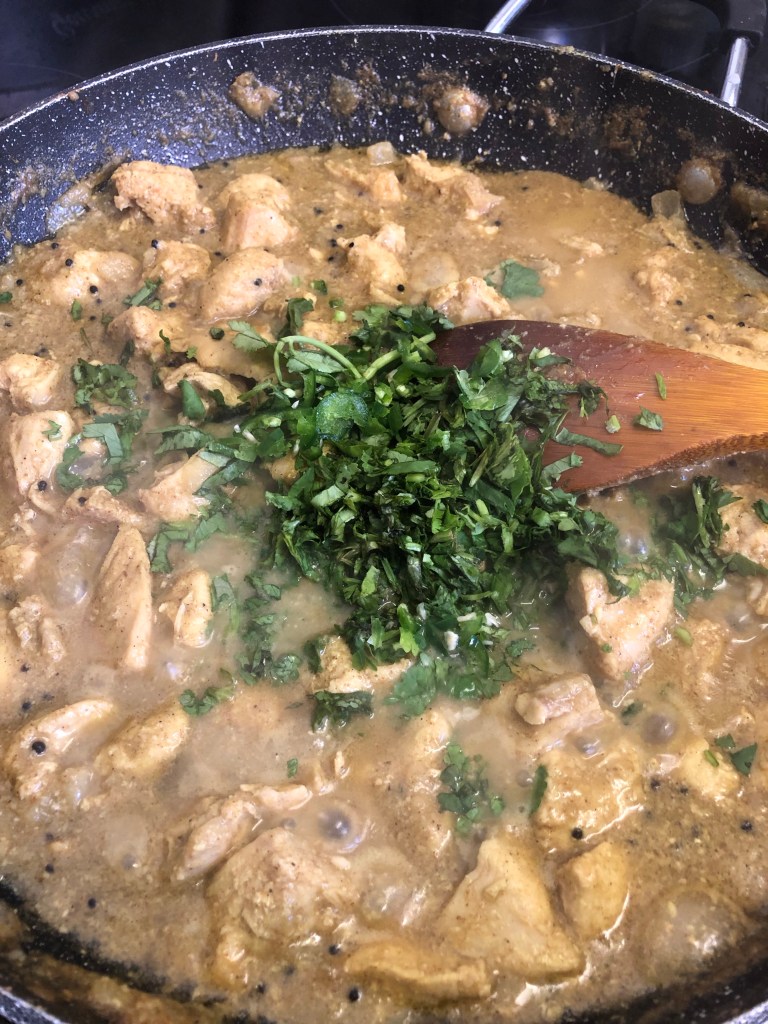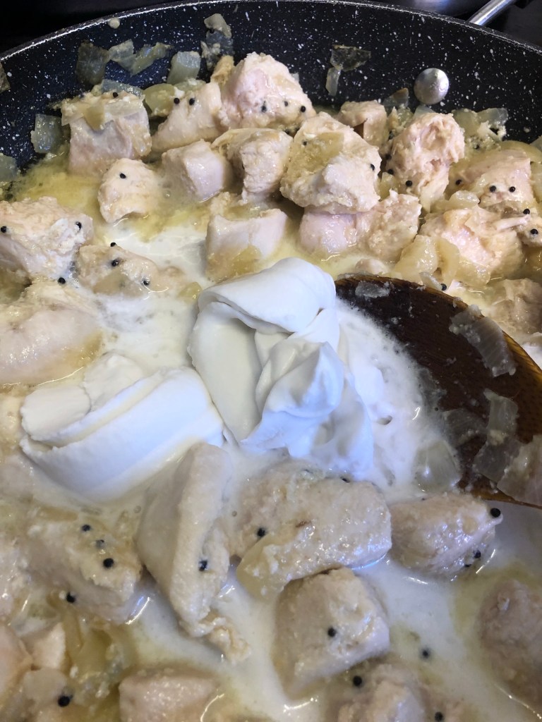 Ingredients- 1/3 of a cup of vegetable oil, 1 1/2 tsp of black mustard seeds, 2 onions finely chopped, 2 large heaped tbsp of garlic and ginger paste, 5 curry leaves, 4 green cardamom pods, 500g of chicken breasts cut into small pieces, 2 tbsp of ground almonds, 100g of creamed coconut, 200ml of coconut milk, 1/4 tsp of turmeric, 1/4 tsp of chilli powder, 1 1/2 tbsp of garam masala, 2 tsp of salt, 1 tsp caster sugar, 2 green chillies finely diced, 200g of plain yogurt and a good handful of coriander finely chopped.