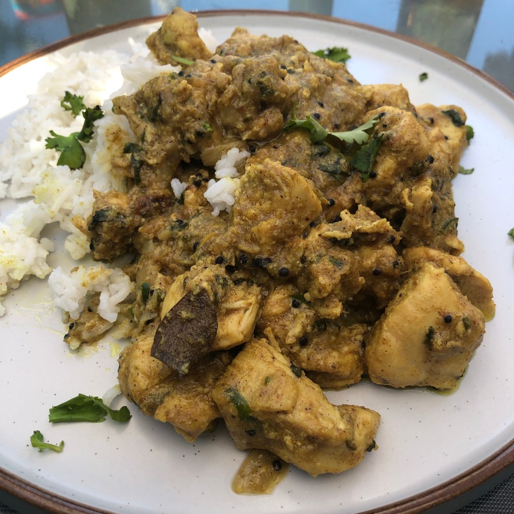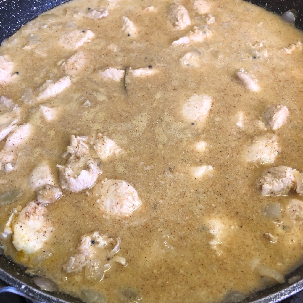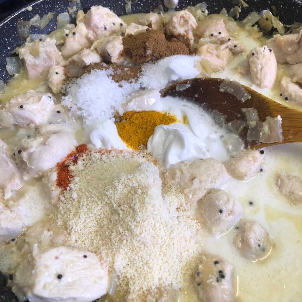 Ingredients- 1/3 of a cup of vegetable oil, 1 1/2 tsp of black mustard seeds, 2 onions finely chopped, 2 large heaped tbsp of garlic and ginger paste, 5 curry leaves, 4 green cardamom pods, 500g of chicken breasts cut into small pieces, 2 tbsp of ground almonds, 100g of creamed coconut, 200ml of coconut milk, 1/4 tsp of turmeric, 1/4 tsp of chilli powder, 1 1/2 tbsp of garam masala, 2 tsp of salt, 1 tsp caster sugar, 2 green chillies finely diced, 200g of plain yogurt and a good handful of coriander finely chopped.