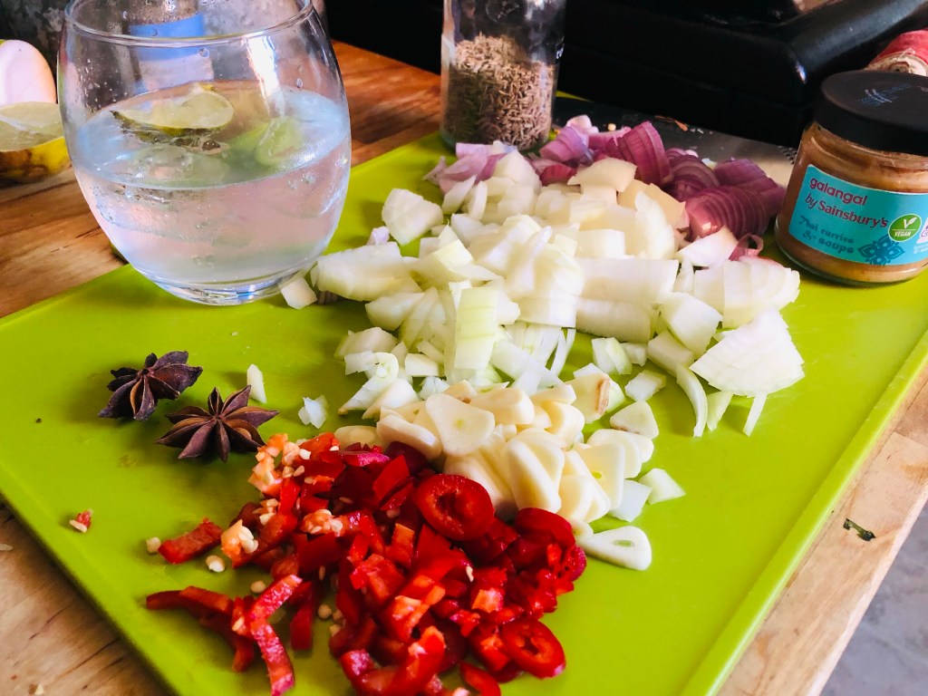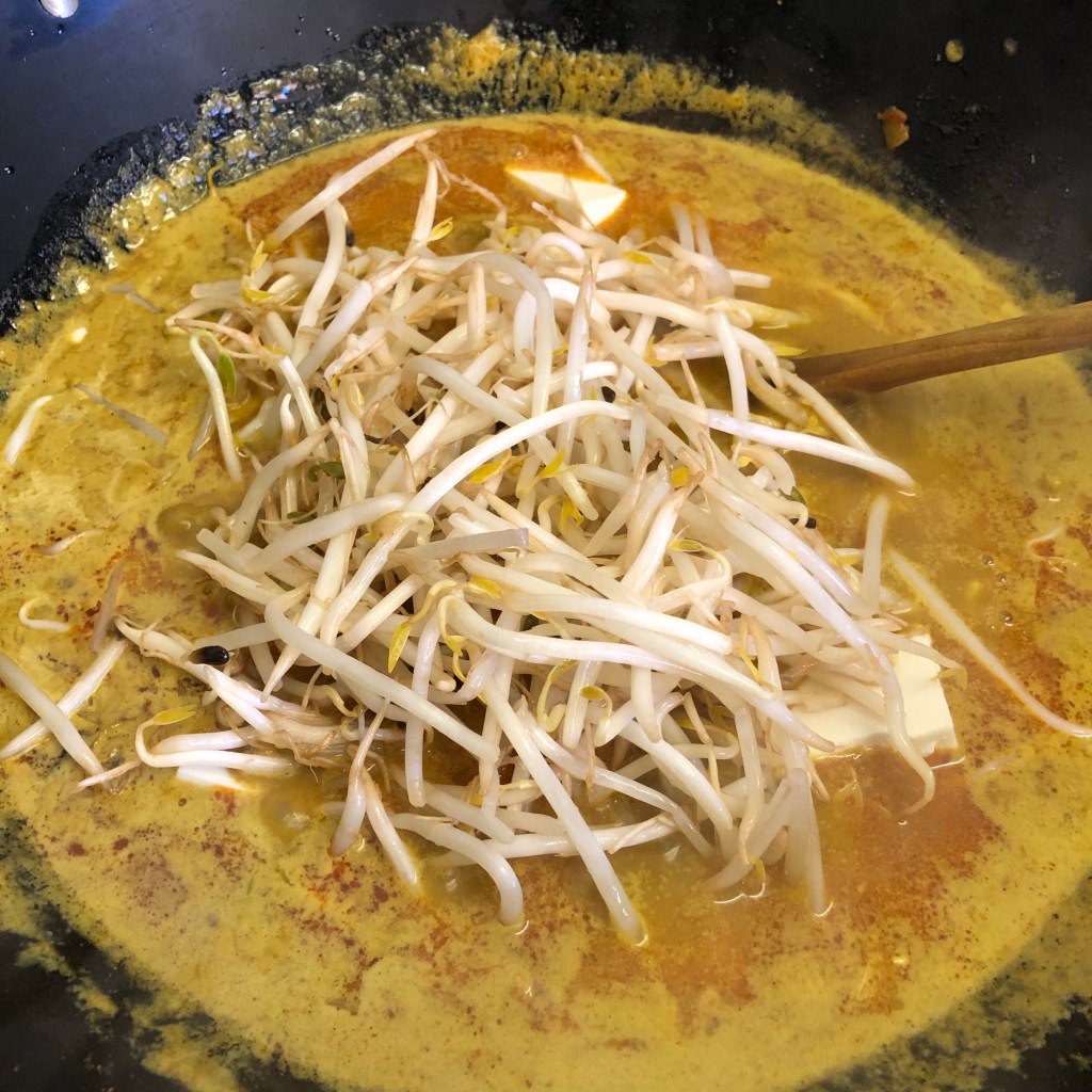 Ingredients- 2 tbsp of sunflower oil, 6 shallots ( I had 4 but also used a small onion) diced, 4 garlic cloves finely chopped, 2 red chillies finely chopped, 1 tsp of turmeric, 2 star anise, 1 heaped tsp of galangal, seeds from for cardamom pods, 2 tbsp of curry powder, 400ml of coconut milk, 400ml of vegetable stock, 1 tsp of fish sauce, 1 box of tofu cut into bite size cubes, beansprouts, salt and diced coriander.