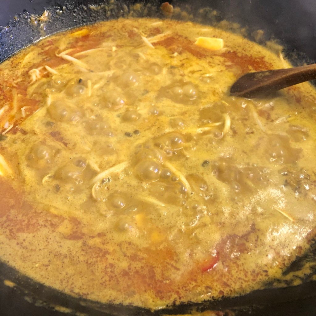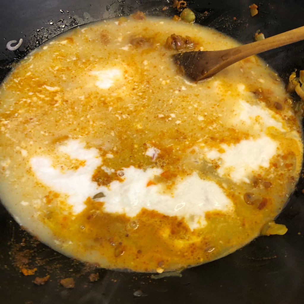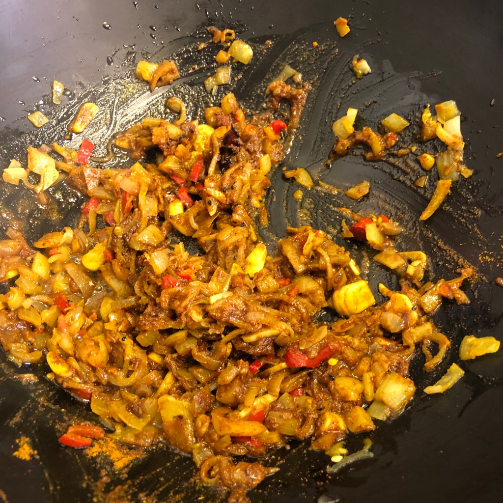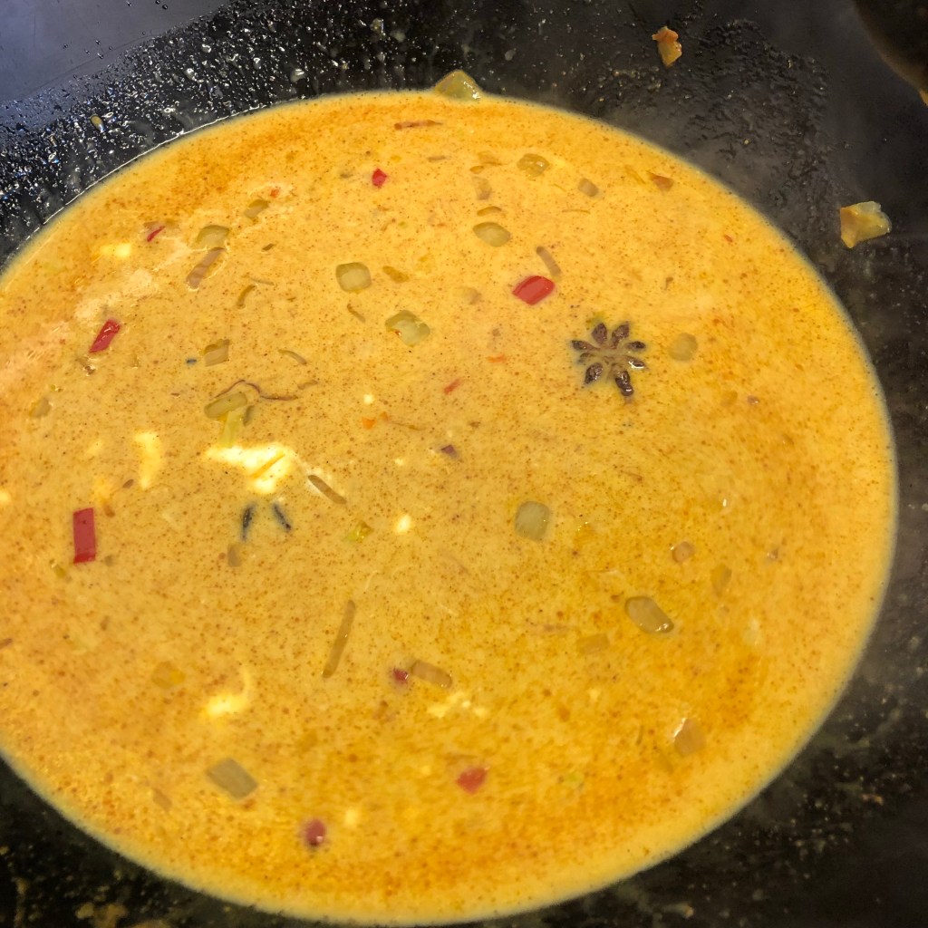 Add the red chillies, turmeric, star anise, galangal & cardamom seeds then cook until the garlic is cooked which should be a minute or so.