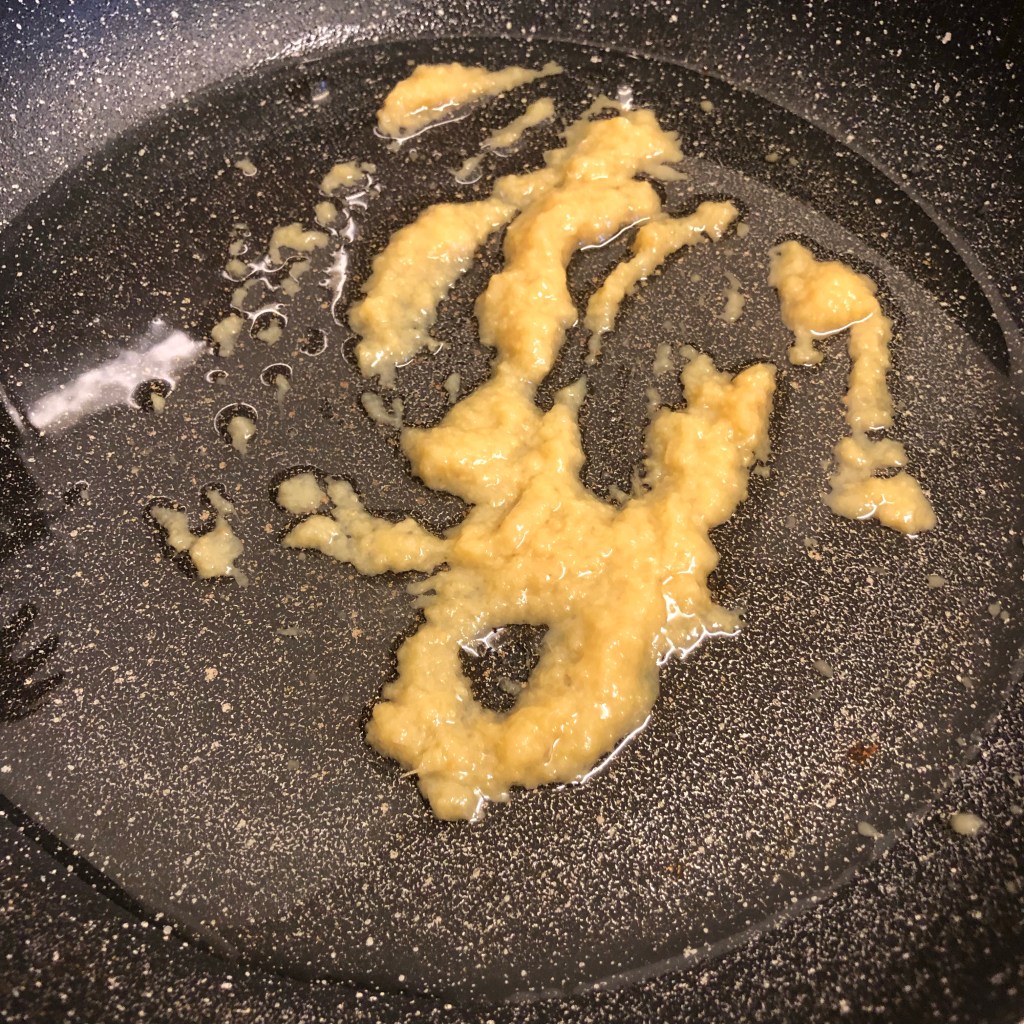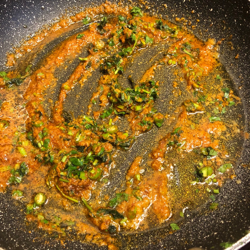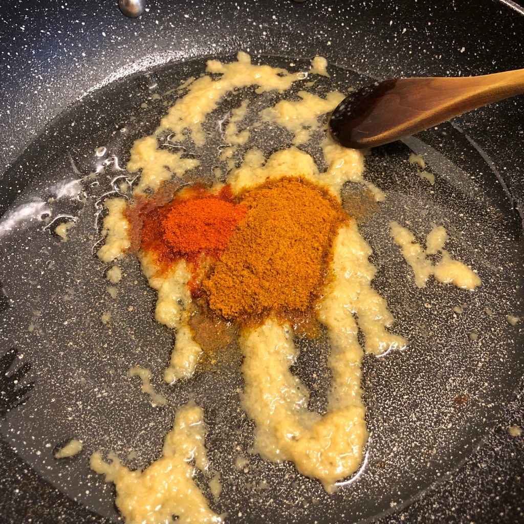 Heat the rapeseed oil. Once the oil is hot add the garlic and ginger paste and coat the pan and oil with the paste.