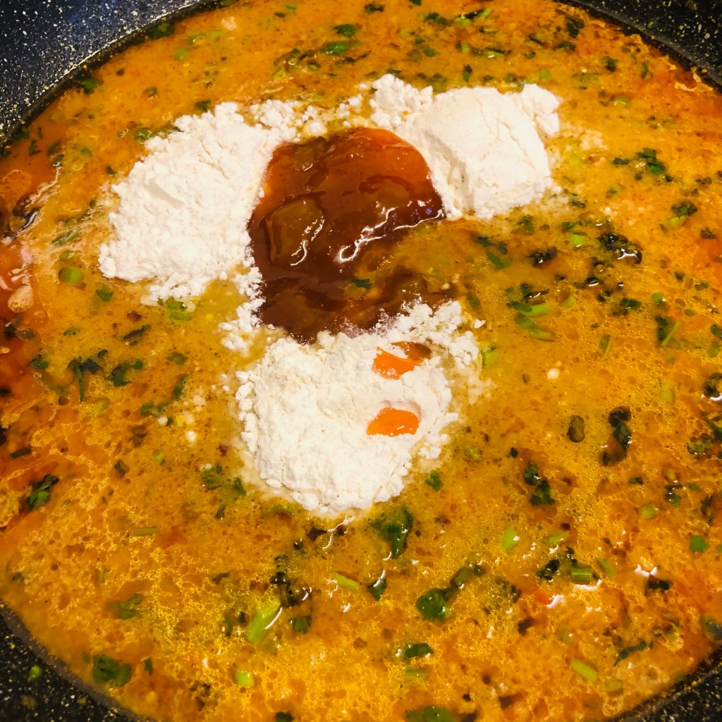 Add the flour and mango chutney. The flour will naturally thicken the curry sauce.