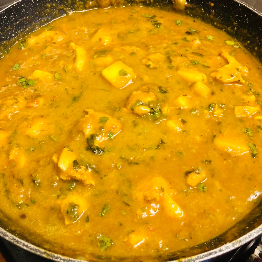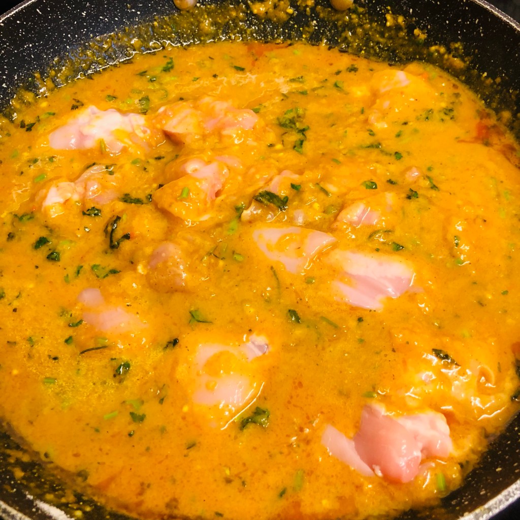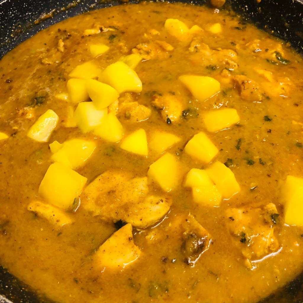 Ingredients- 2/3 tbsp of rapeseed oil, 2 tbsp of heaped garlic & ginger paste, 1 tbsp of curry powder, 1 tsp of chilli powder, 3 tbsp of coriander stalks, 2 green chillies finely diced, 2 cups of premade base sauce, 6 tbsp of coconut flour ( which I didn’t have so I used 3 tbsp of plain flour) 4 tbsp of mango chutney, chicken, salt to taste, a large quantity of mango pieces ( I purchased a bag of frozen diced mango) 1 tsp of garam masala, 1 tsp of dried fenugreek leaves, handful of chopped coriander.