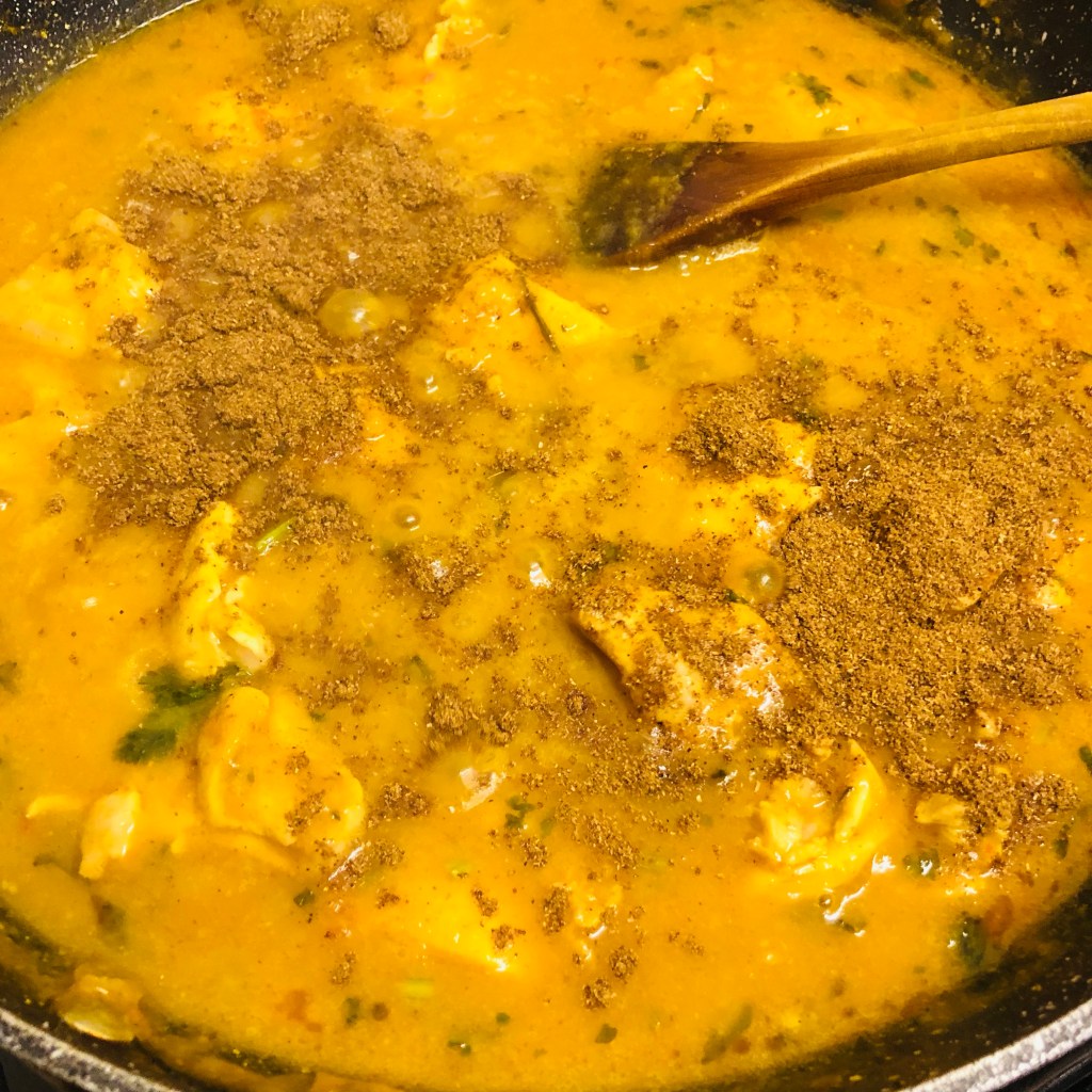 Once the chicken is cooked add the the garam masala, salt and the mango pieces. Just allow these to warm through.