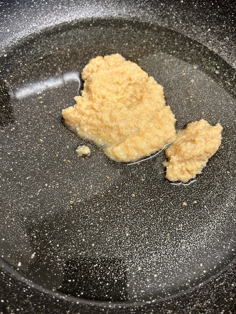 Method- heat the rapeseed oil. Once the oil is nice and hot add the garlic and ginger paste stirring it around the pan to flavour the oil.