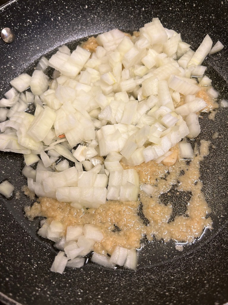 Once the garlic and ginger paste has cooked out after a minute add the diced onion and fry for 3/5 minutes mixing it into the flavoured oil.