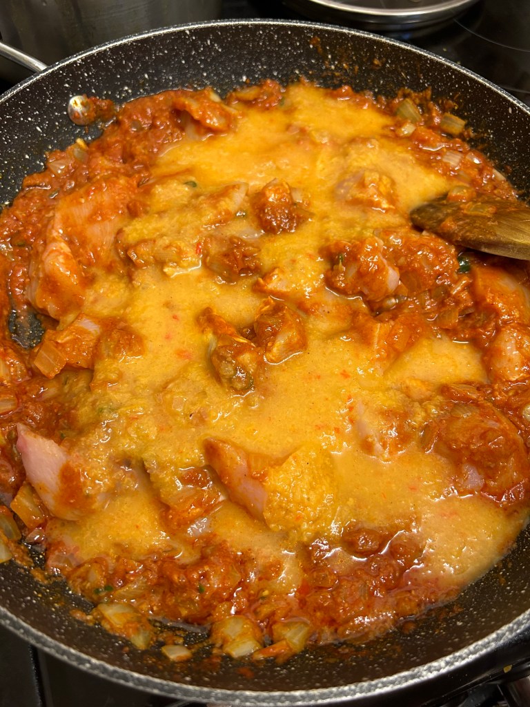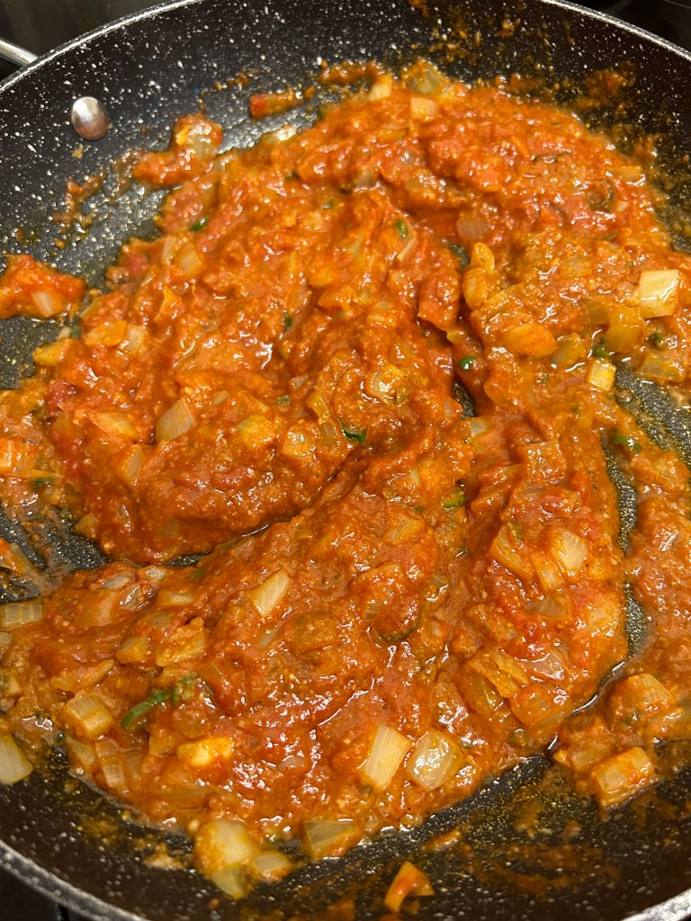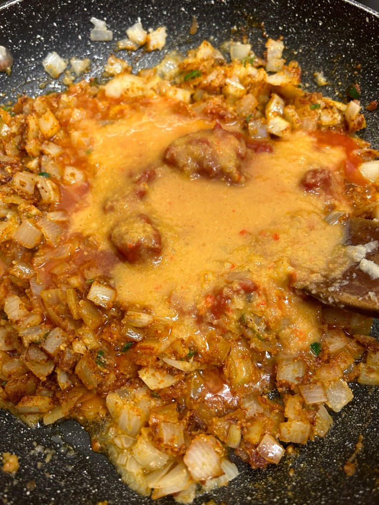 Don’t let the spices catch. Make sure everything is coated then add the tomato purée followed by the 1/2 a cup of the base sauce only.