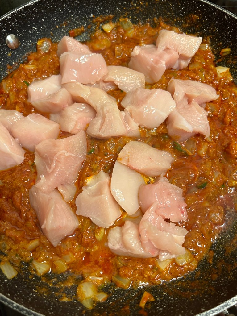As the chicken cooks add the remaining base sauce allowing it to simmer. If you don’t want it too ‘saucy’ just add what suits you.