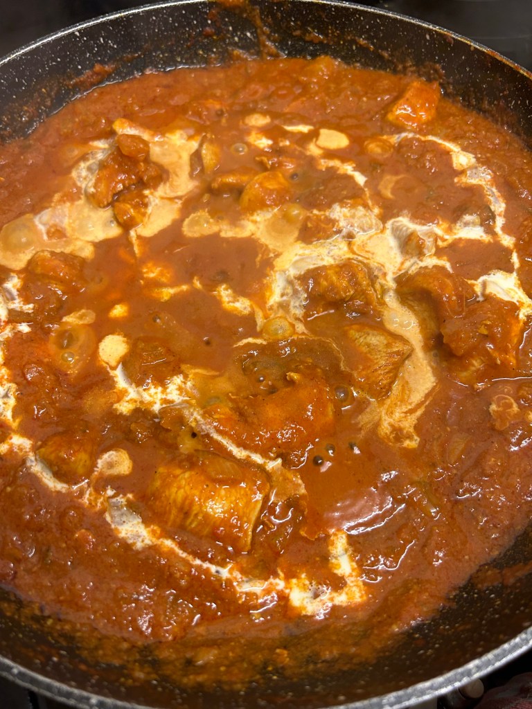 Ingredients- 3 tbsp of rapeseed oil, 2 large heaped tbsp of garlic and ginger paste, 1 large onion finely diced, 3 green finger chillies finely diced, 2 tbsp of homemade curry powder, 1 tsp of chilli powder, 1/2 cup of tomato purée mixed with a little water, 2 cups of pre-made base sauce, 1/2 cup of single cream, 1/2 tsp of garam masala, pinch of salt, small handful of chopped coriander and 2tbsp of butter to finish the dish.