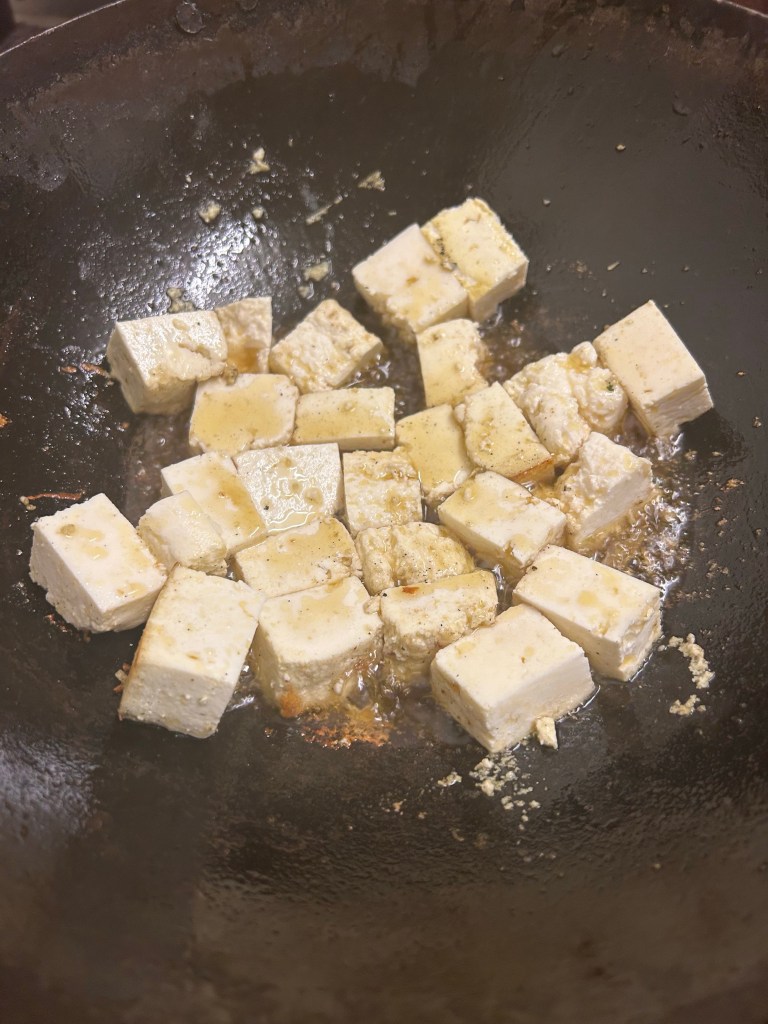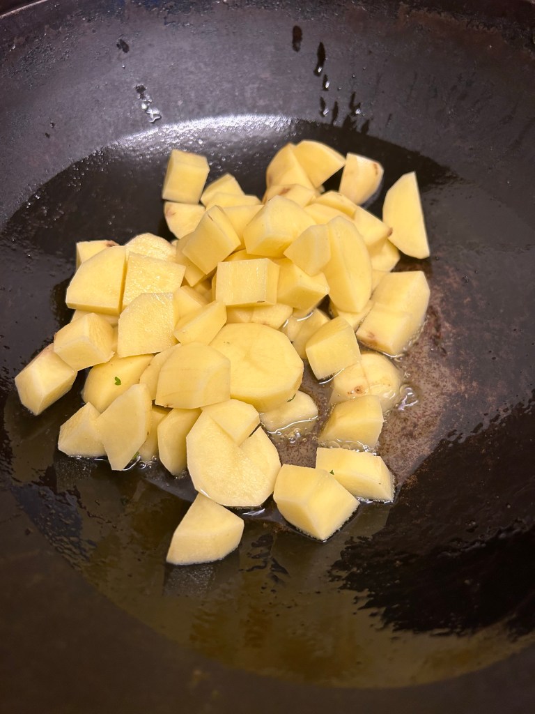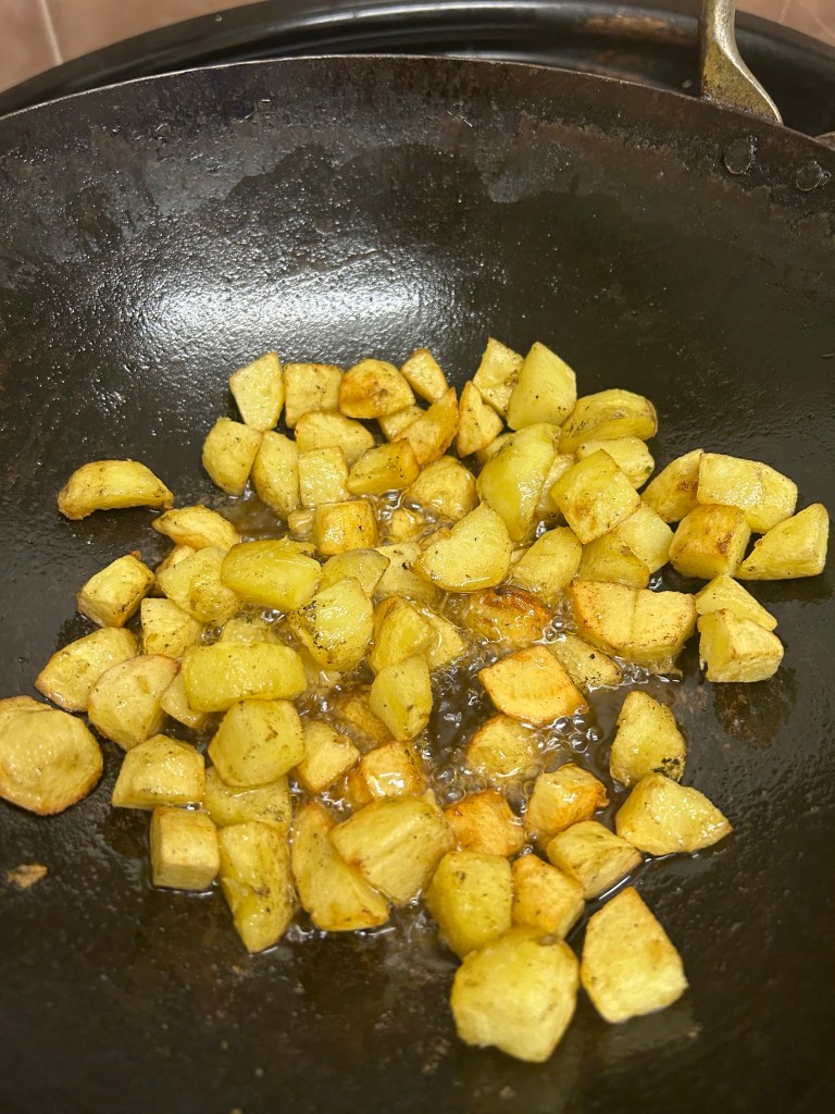 Method- heat 2 tbsp’s of the oil in a pan, I used my Indian Karahi pan for this, once the oil is hot add the pieces of potato and shallow fry them for 6-8 minutes to give them a beautiful crispy texture.
