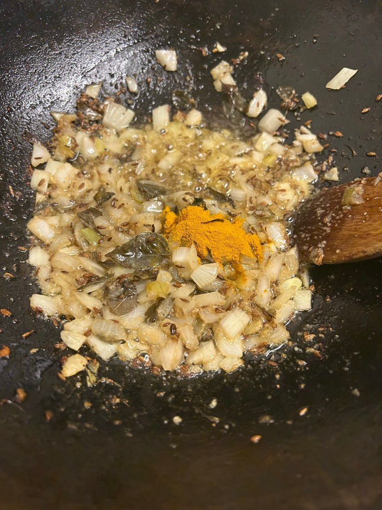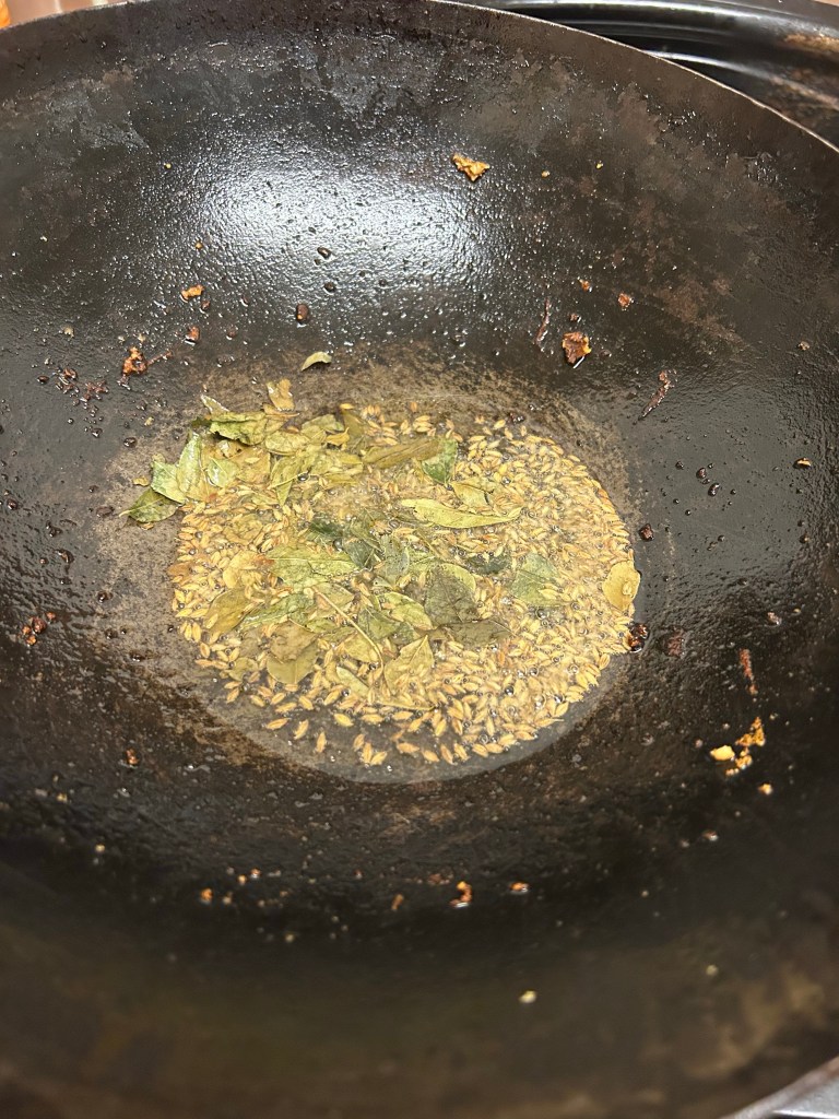 Add the remaining oil, once hot add in the curry leaves and cumin seeds allowing them to sizzles for a few seconds.