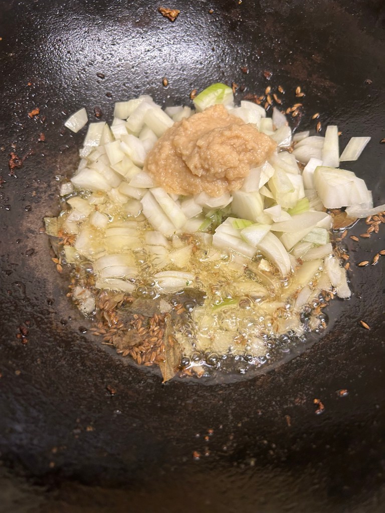 Add the onion along with the garlic & ginger paste. Fry this off for 5 minutes or so just as the onion is starting to brown.