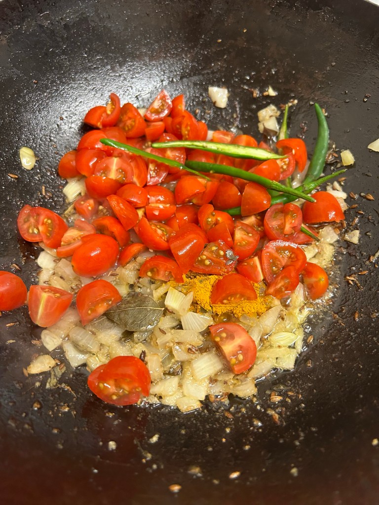 Add the turmeric, giving it a stir quickly followed by the diced tomatoes and chillies.