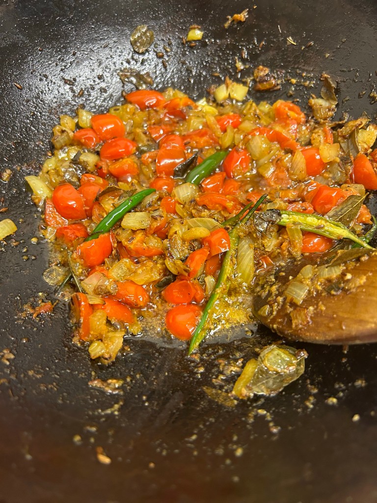 Fry this off until the tomatoes have started to break down which is the start of a beautiful sauce infused with flavour.