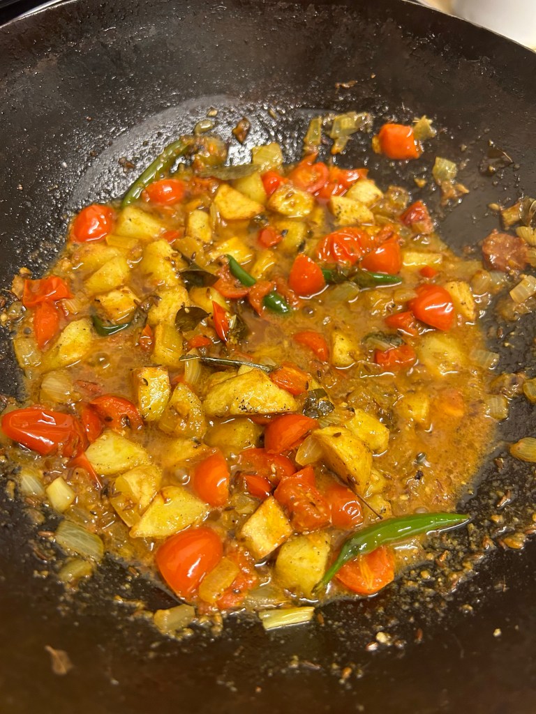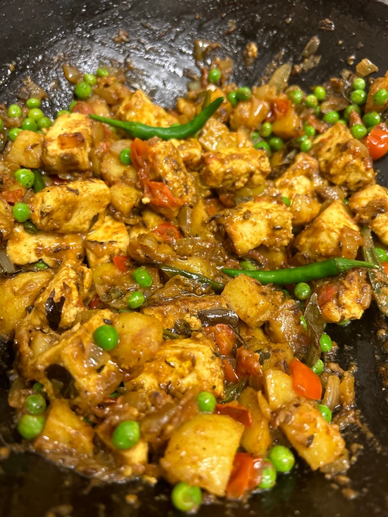 Ingredients- 4 tbsp of vegetable oil, 250g of waxy potatoes such as a Charlotte, peeled and cut into cubes, a small pack of shop bought paneer again cut into small cubes, 12 curry leaves, 1 tsp of cumin seeds, 1 onion finely diced, 1 heaped tbsp of garlic & ginger paste, 1/2 tsp of turmeric, 3 finger chillies slit lengthways, 250g of small vine tomatoes, 1/2 tsp of garam masala, 175g of frozen peas.