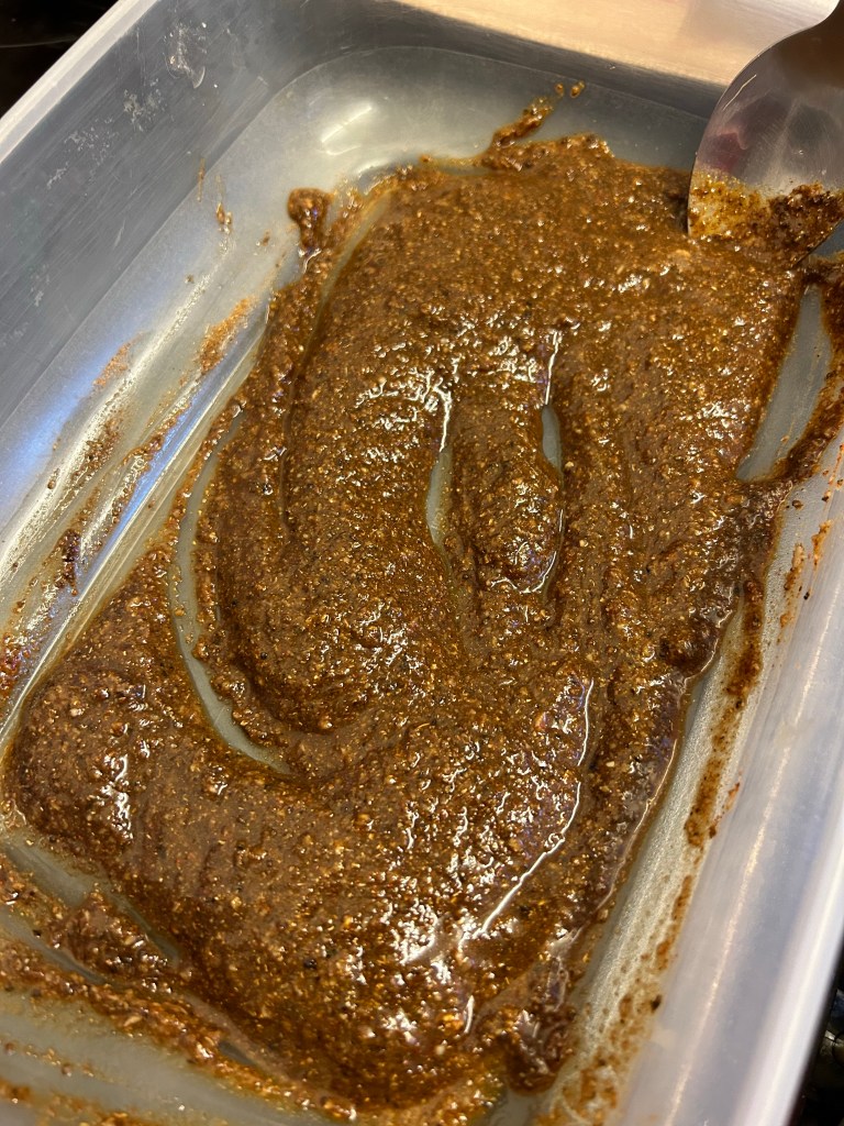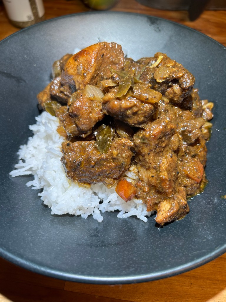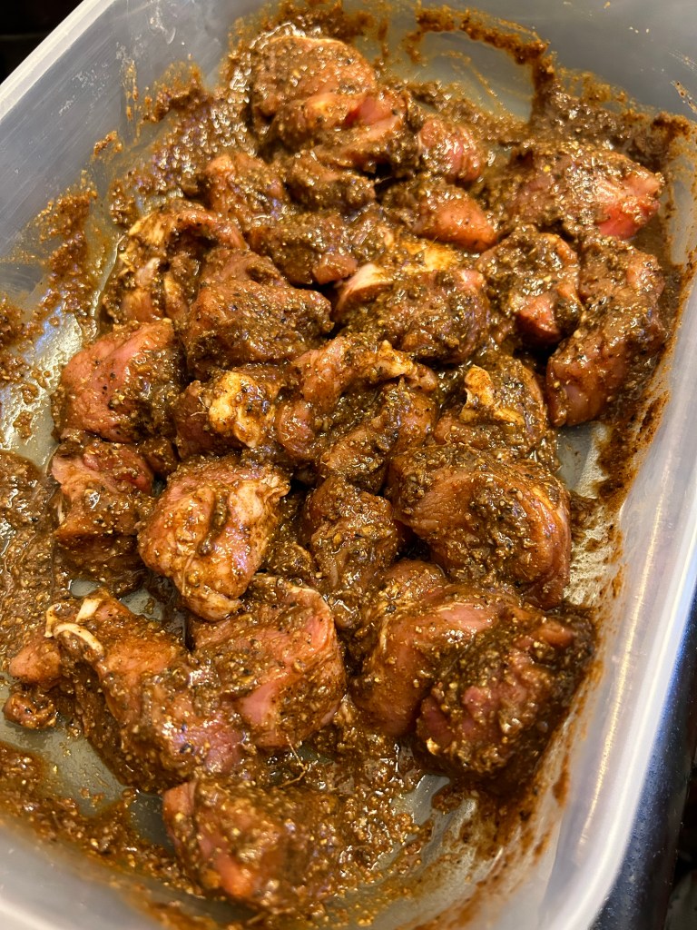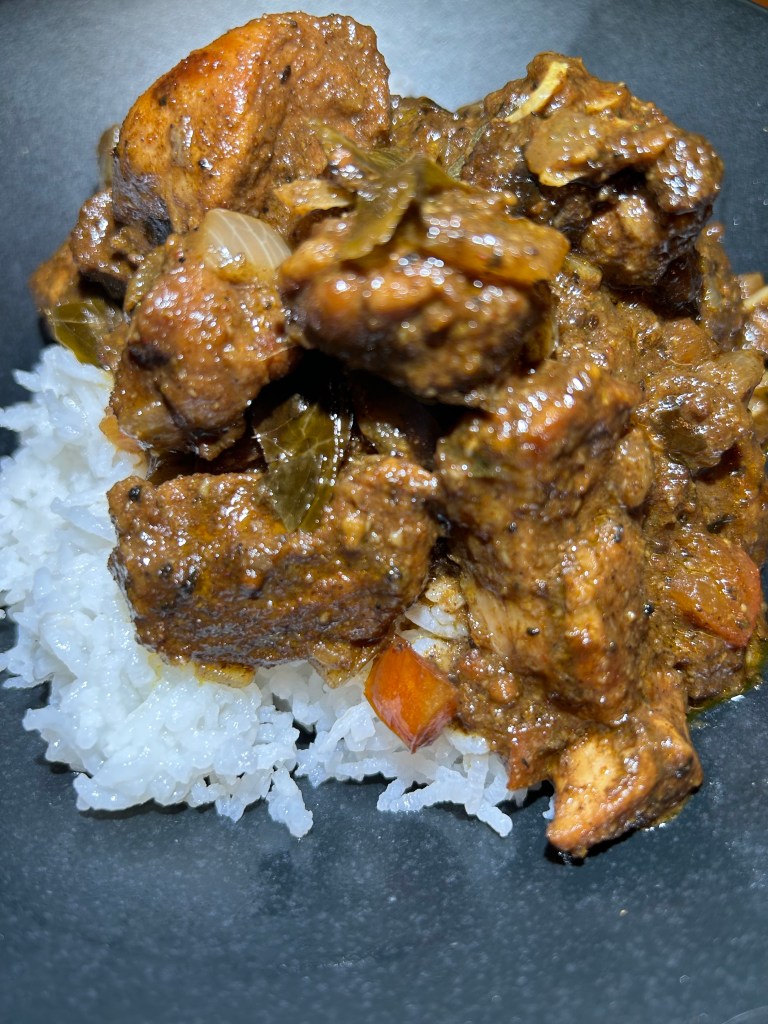 Marinade – 1 tsp of chilli powder, 1 1/2 tbsp of ground cumin, 1 1/2 tbsp ground coriander, 1/2 tsp fenugreek powder, 1/2 tsp of ground cloves, 1 tbsp of ground pepper, 1/2 tsp of turmeric, 3/4 tsp of ground cinnamon, 1/2 tsp of ground cardamom, 4 green chillies finely diced, 5 tbsp of red wine vinegar, 2 tbsp of brown sugar, 1 tbsp of tamarind paste, 3 tbsp of garlic and ginger paste.