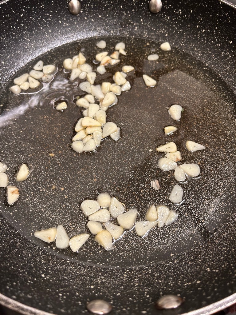 Heat the oil in pan over a low heat. Add all the garlic slivers and gently cook for 20 minutes. Once they are cooked remove them to a plate leaving as much oil as you can. This was my second mistake. I turned up the heat and tried to fry the garlic too quickly š
