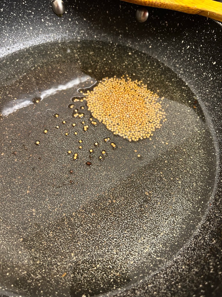 Once the garlic has been removed add the mustard seeds to the hot oil.
