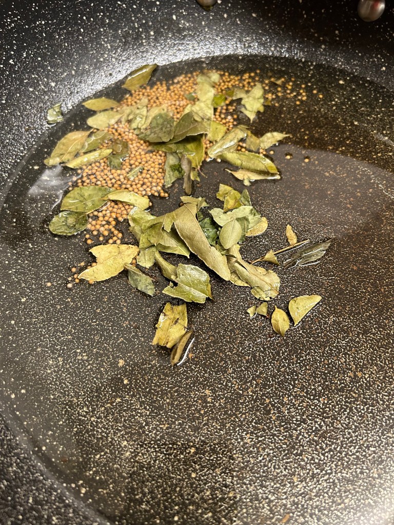Once the mustard seeds start popping add the curry leaves. Give them a good stir and cook for 30 seconds or so.