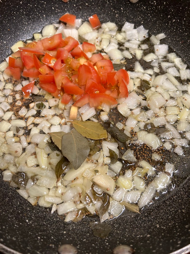 Add the chopped tomatoes, chilli powder, bay leaves and the pork marinade.