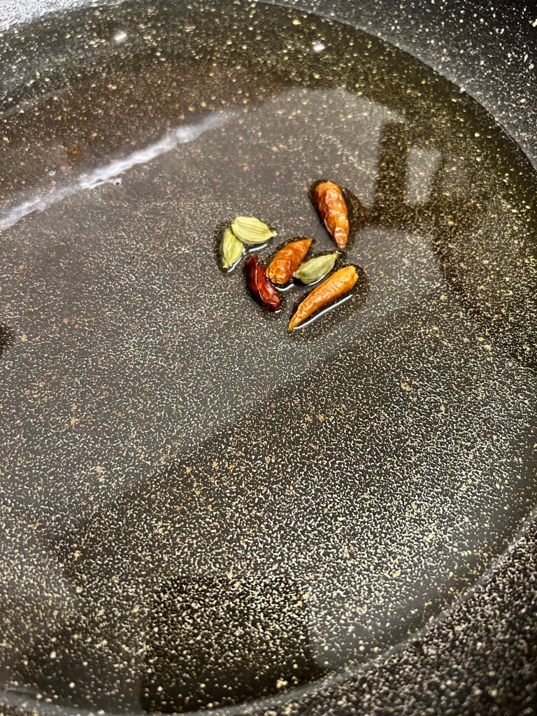 Heat the rapeseed oil in a pan, once hot and glistening add the dried chillies and cardamom pods allowing them to sizzle for 30 seconds or so to flavour the oil.