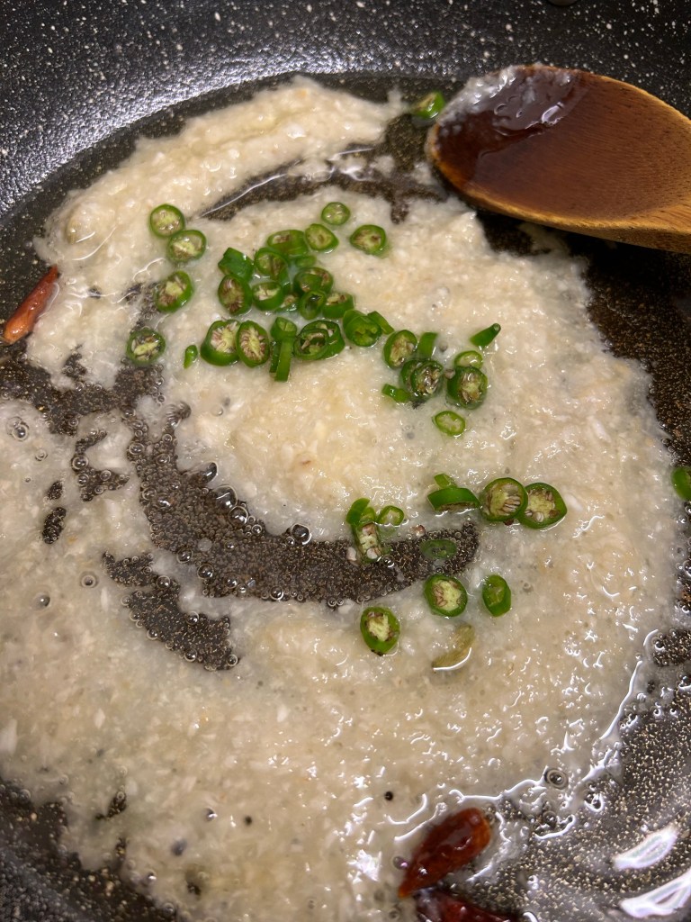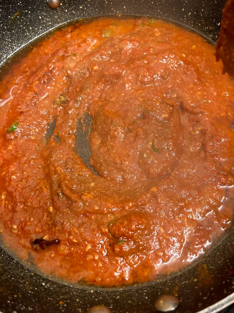 Ingredients- 3 tbsp of rapeseed oil, 2-4 dried Kashmiri chillies, a couple of green cardamom pods slightly bruised, 3 tbsps of garlic and ginger paste, 2 green finger chillies finely diced ( or more if you require ) 1/2 cup of tomato purée mixed with water, 2 tbsps of ground cumin, 1 tsp of ground coriander, 1/4 tsp of ground turmeric, 2 tbsp of homemade curry powder ( already posted this recipe) 2 cups of homemade base sauce (already posted this recipe) precooked homemade tandoori chicken, 1-2 tbsps of smooth mango chutney, juice of a lime, salt to taste, a tsp of garam masala to season and chopped coriander to serve.