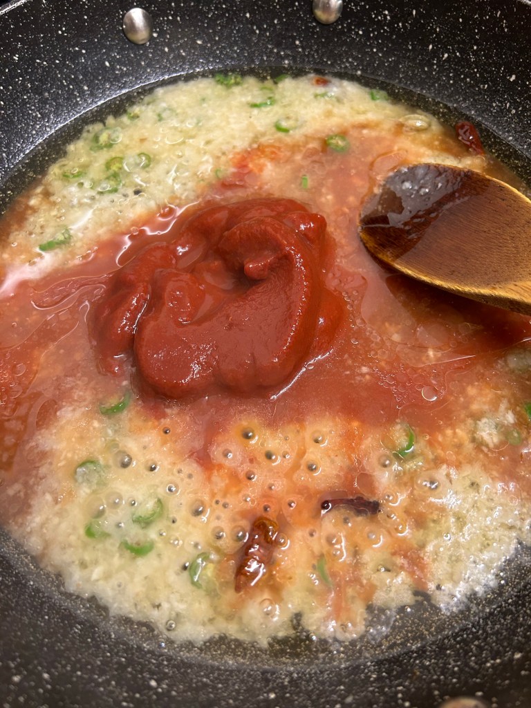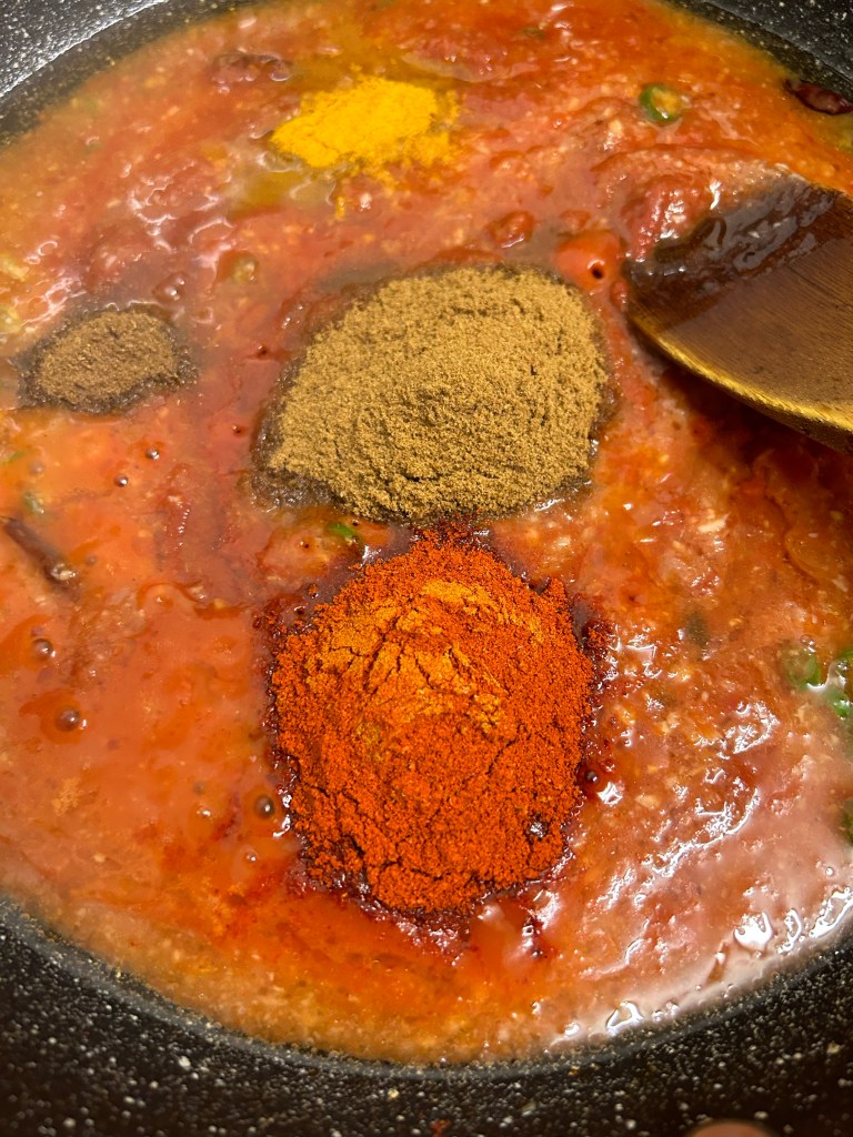 Add the tomato purée followed by the dried spices – cumin, coriander turmeric, chilli powder & homemade curry powder.