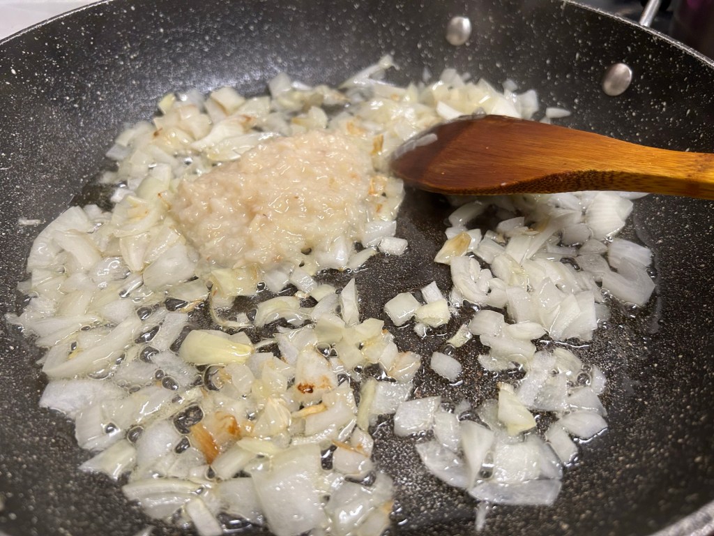 Once the butter has melted and the pan is nice & hot add the diced onion, fry for 3/5 minutes until it becomes nice and translucent then add in the garlic & ginger paste, stir cooking this out for 30 seconds.