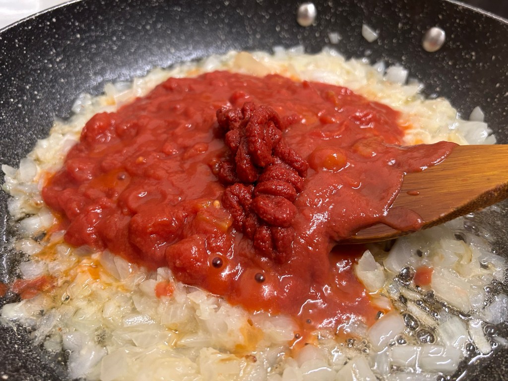 Once your kitchen smells all garlicky add the chopped tomatoes…..