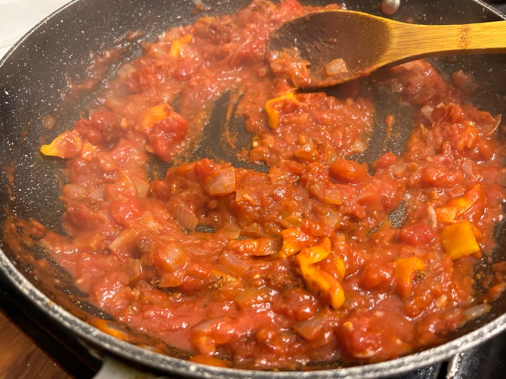 Give the pan a good stir for a couple of minutes. Add 2 heaped tsps of the pav bhaji masala along with 1 tsp of Kashmiri chilli powder plus another pinch of salt and the diced small pepper. Stir the pan then allow it to come to a simmer for 3/5 minutes.