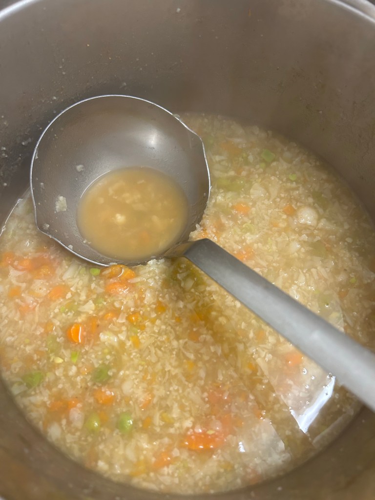 3 heaped tsp of Baj Bhaji masala, a whole cauliflower cut into small bite size florets for cooking, 2 or 3 potatoes peeled and cut into bite size pieces, 2/3 carrots peeled and diced, a cup of frozen peas, 2 tbsp of rapeseed oil, 1 large knob of butter, 1 onion finely diced, 2 heaped tbsp of garlic & ginger paste, salt, tin of chopped tomatoes, 2 tbsp of tomato purée, 1 tsp of Kashmiri chilli powder, diced small pepper, 2 tbsp of dried fenugreek leaves, 1 tsp of garam masala, handful of chopped coriander.
