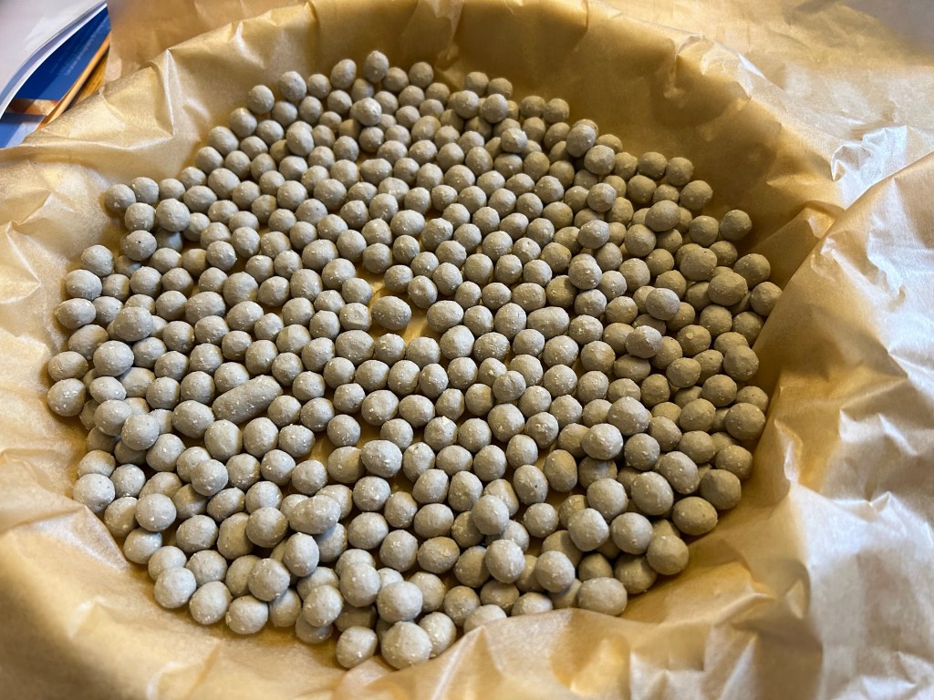 Preheat your oven to 200C / gas mark 6. Line the pastry case with some crumpled greaseproof paper and cover with baking beans. Bake for 12-15 minutes until the edges look a little like cooked biscuit-coloured.