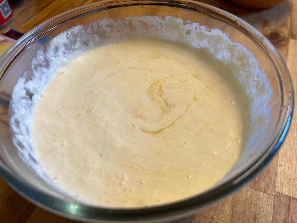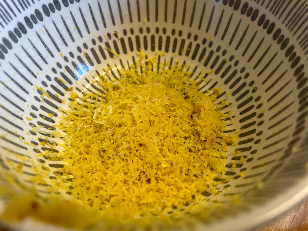 Beat the eggs and sugar together until it’s mixed but not frothy. Add the cream and juice of the lemons. Pour your mixture through a sieve into a jug pushing and mixture through the sieve. Add the lemon zest to the jug and give it a little mix.