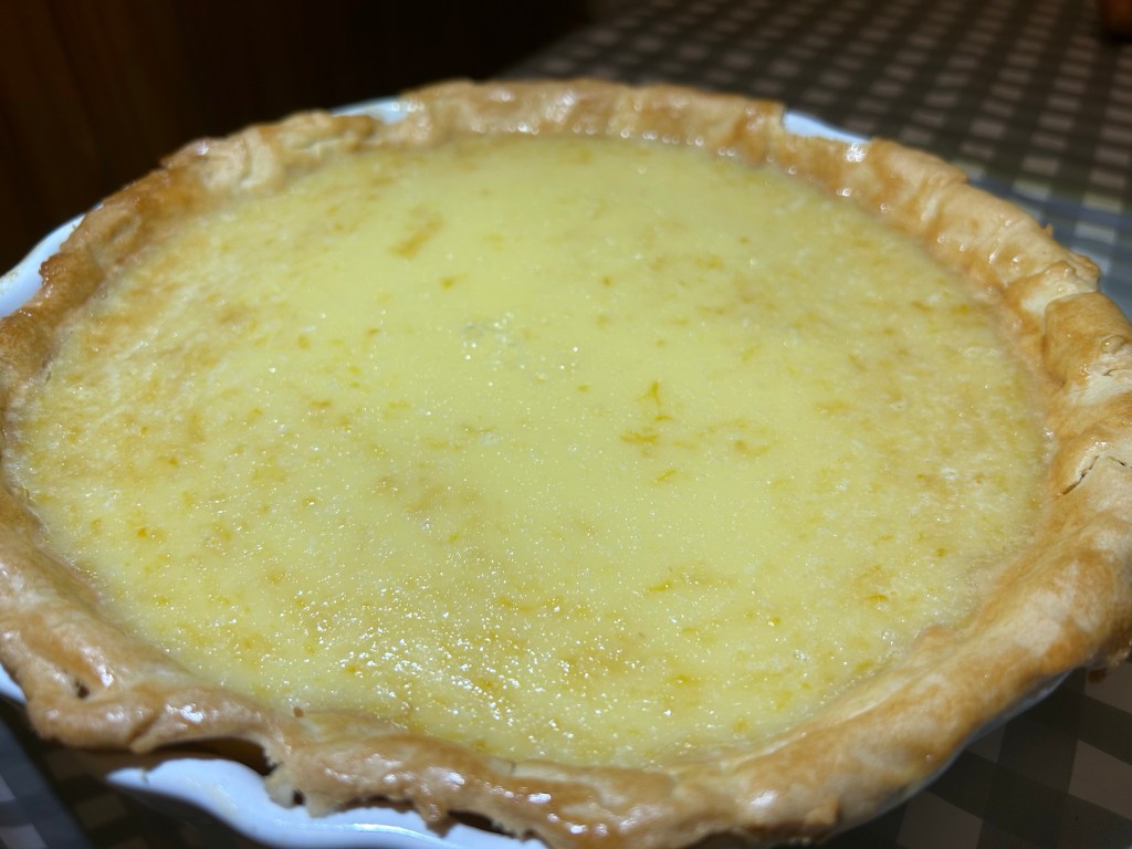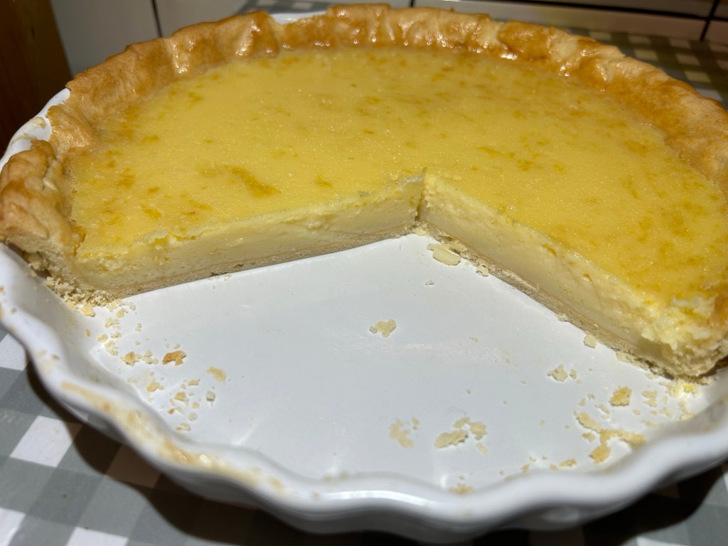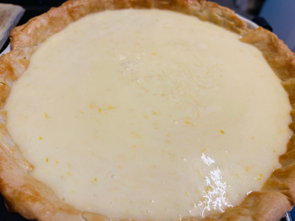 A roll of sweet pastry ( shop bought), 6 medium eggs – beaten, 3 large lemons, 250g of caster sugar & 150ml of double cream.