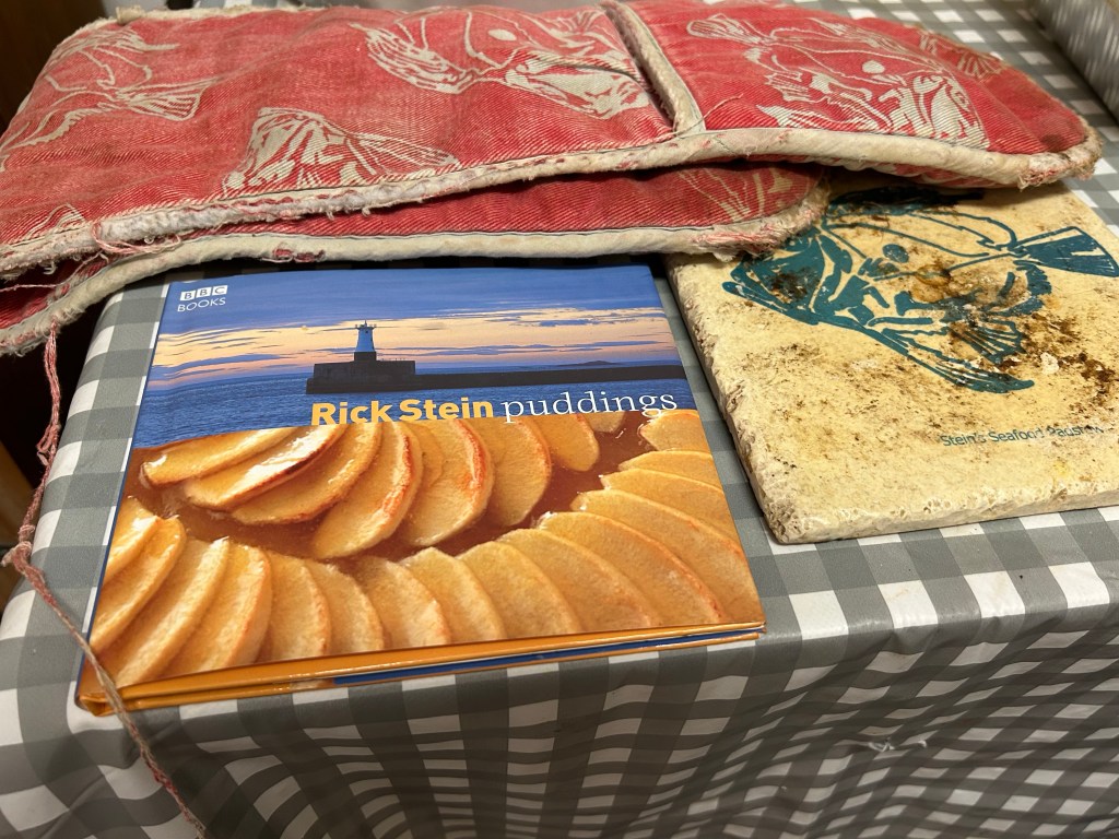 Again the recipe is from my food hero Rick Stein. I picked up this book are part of a set – starters, mains & puddings. Three little unique books which I don’t believe are available anymore. The books were first published in 2004 and I picked them up on a trip to Cornwall in 2008, plus this very old oven glove and plate slate for hot pans. Little pieces of my heart.