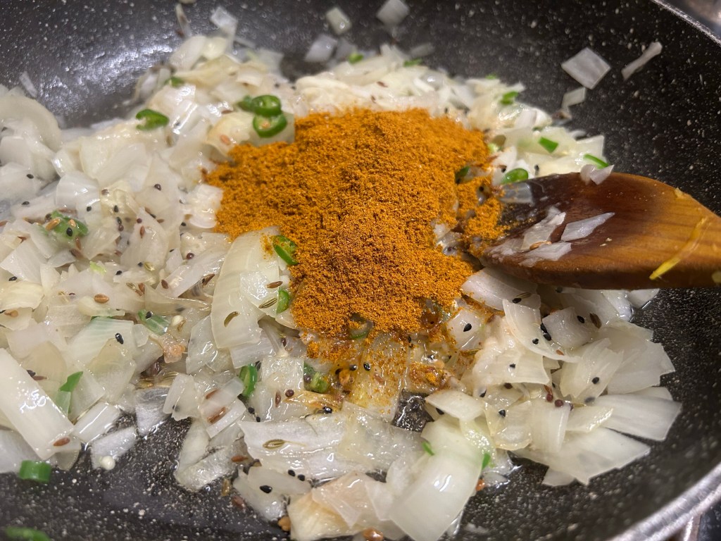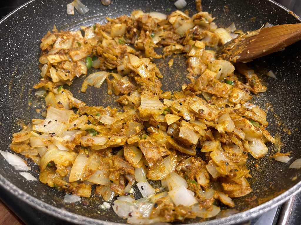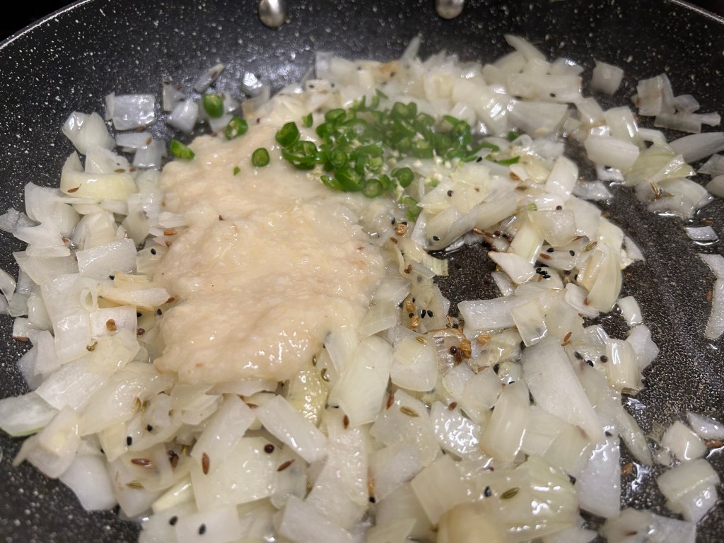 Once the onions are nice and translucent add in the garlic & ginger paste along with the chopped chillies cooking again for another minute.