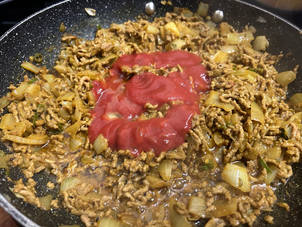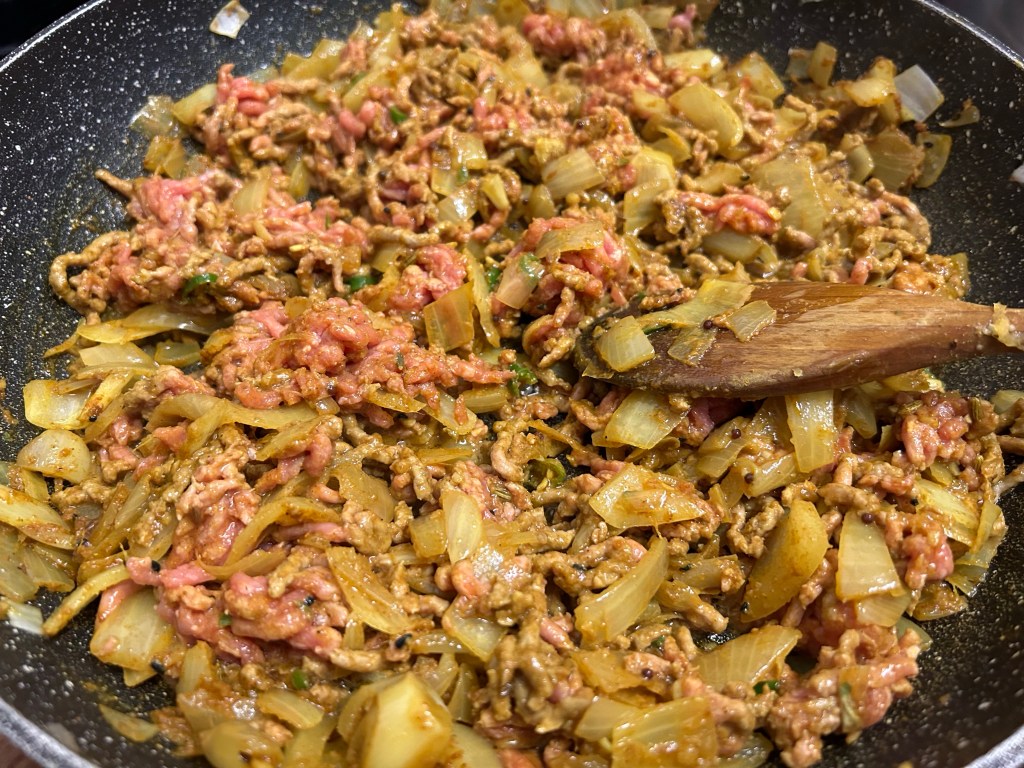 Add the mince breaking it down and giving it a good stir making sure it’s fully coated.