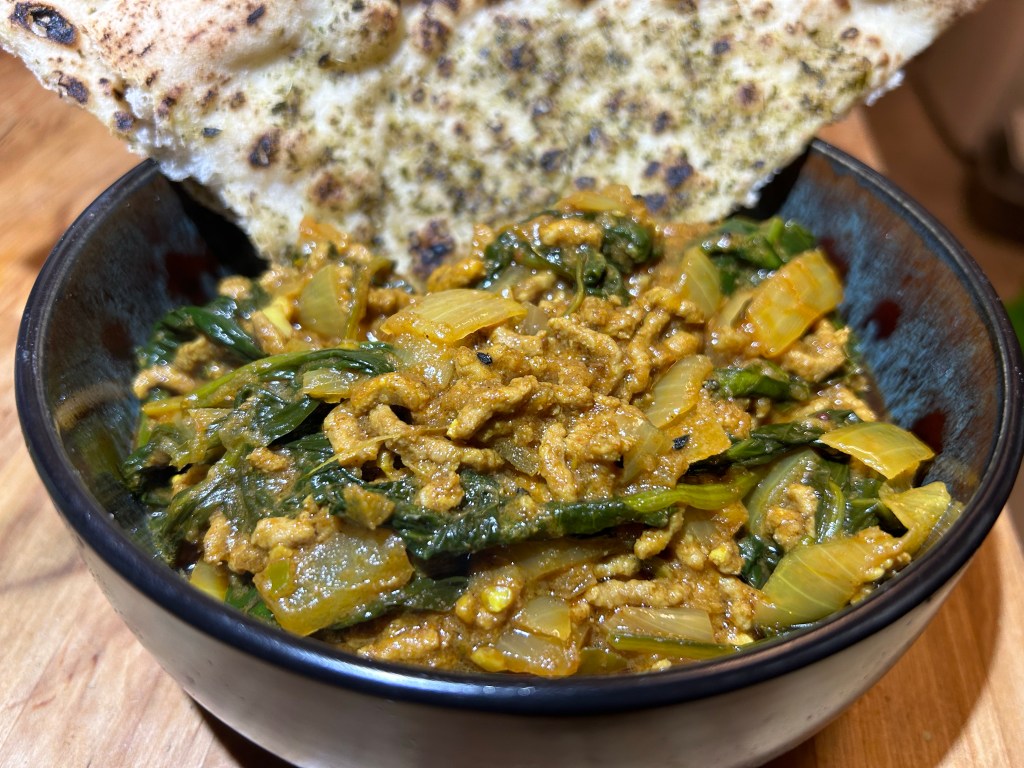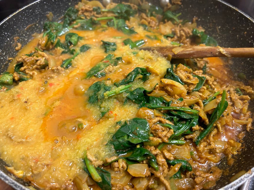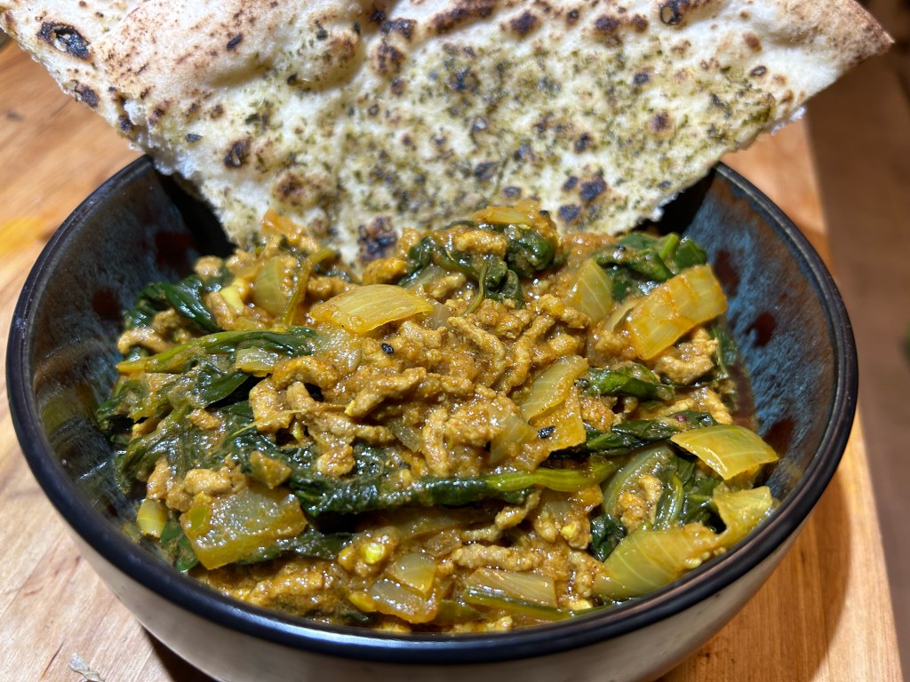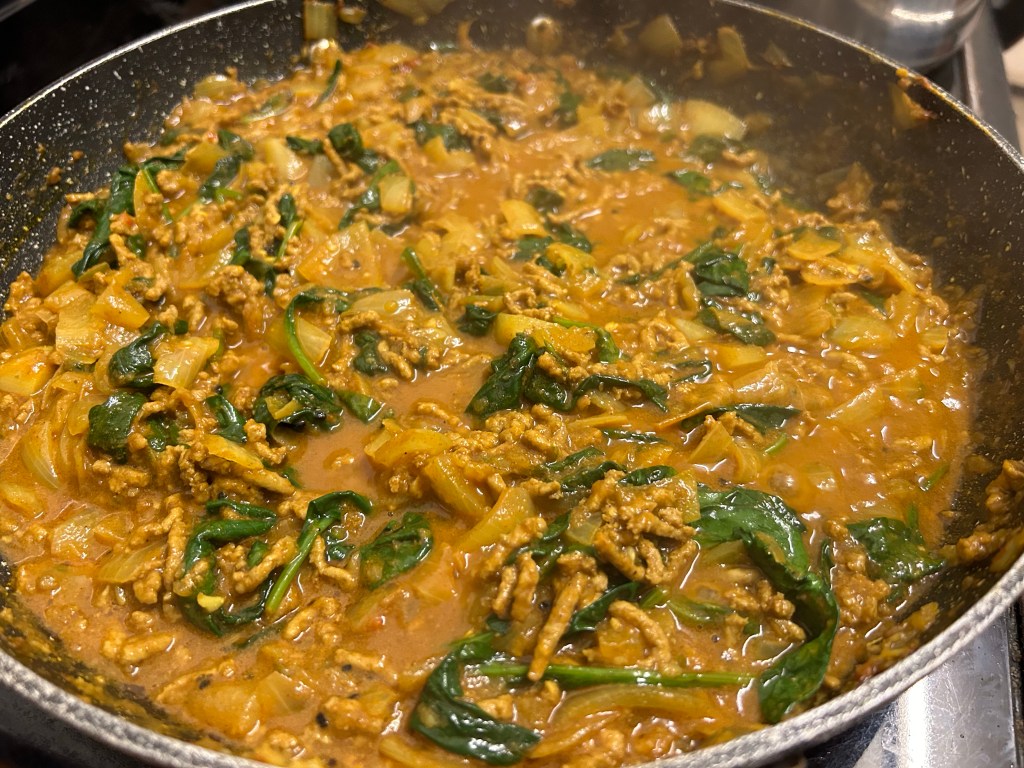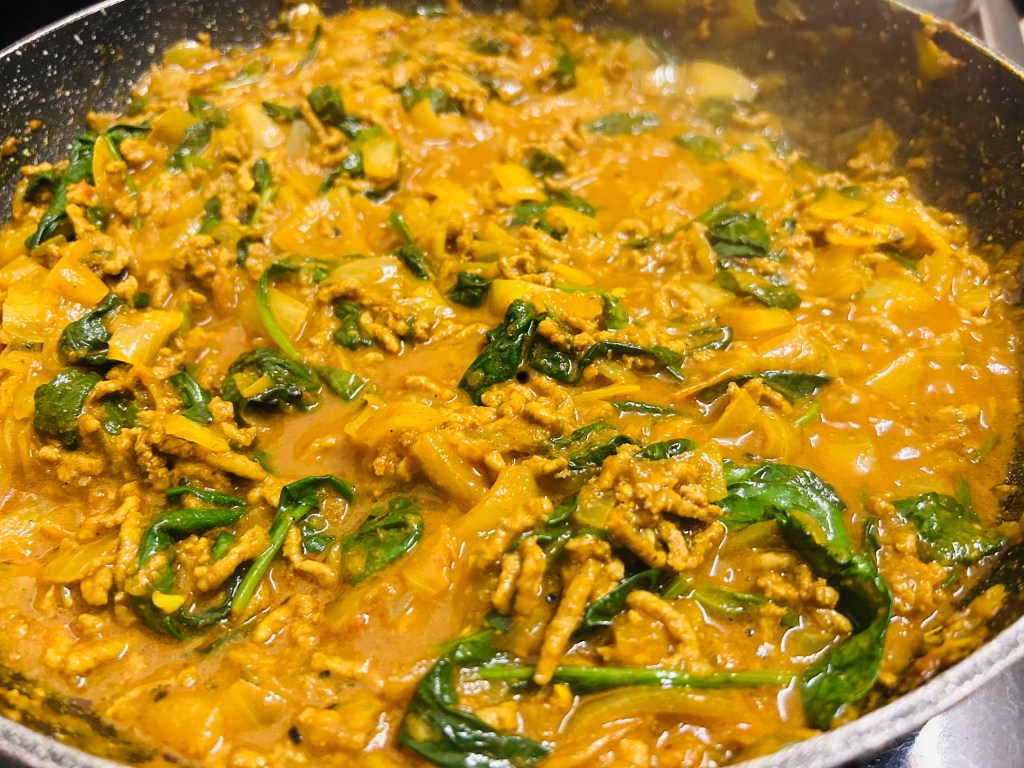 3 tbsp of rapeseed oil, 1 tsp of panch pooran, 2 onions finely diced, 2 tbsp of garlic & ginger paste, 2 green chillies finely diced, 2 tbsp of homemade curry powder, 1 packet of minced lamb, 150ml of passata, a bag of spinach leaves, 1 cup of pre-made base sauce, salt to taste and a pinch of garam masala.