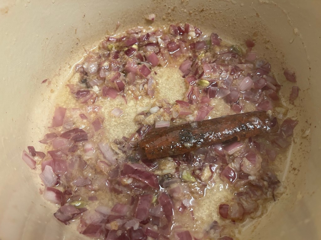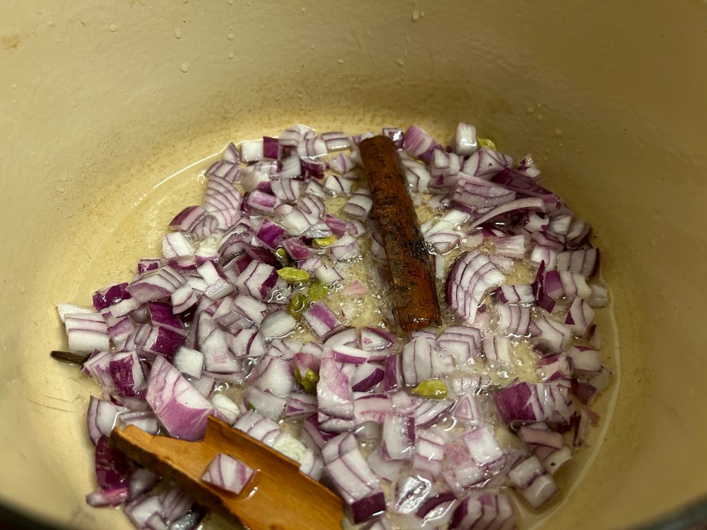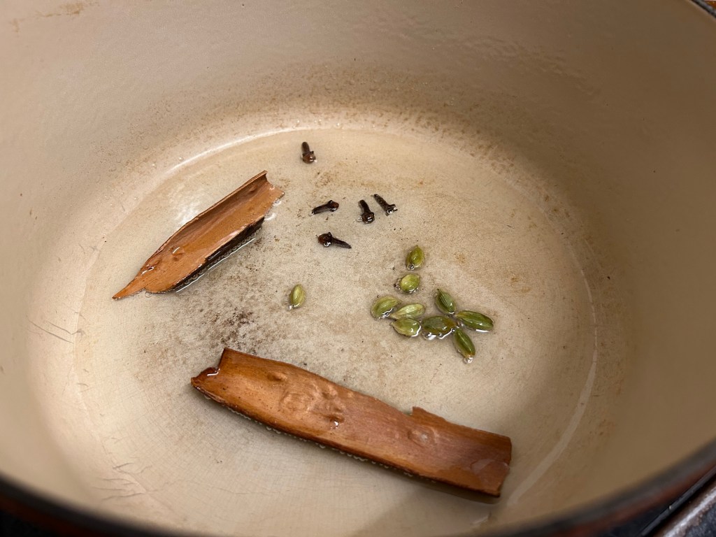 Put the oil in a large heavy based pan, when visibly hot add the cinnamon sticks, cloves & cardamom pods letting the spices sizzle for 30 seconds or so.
