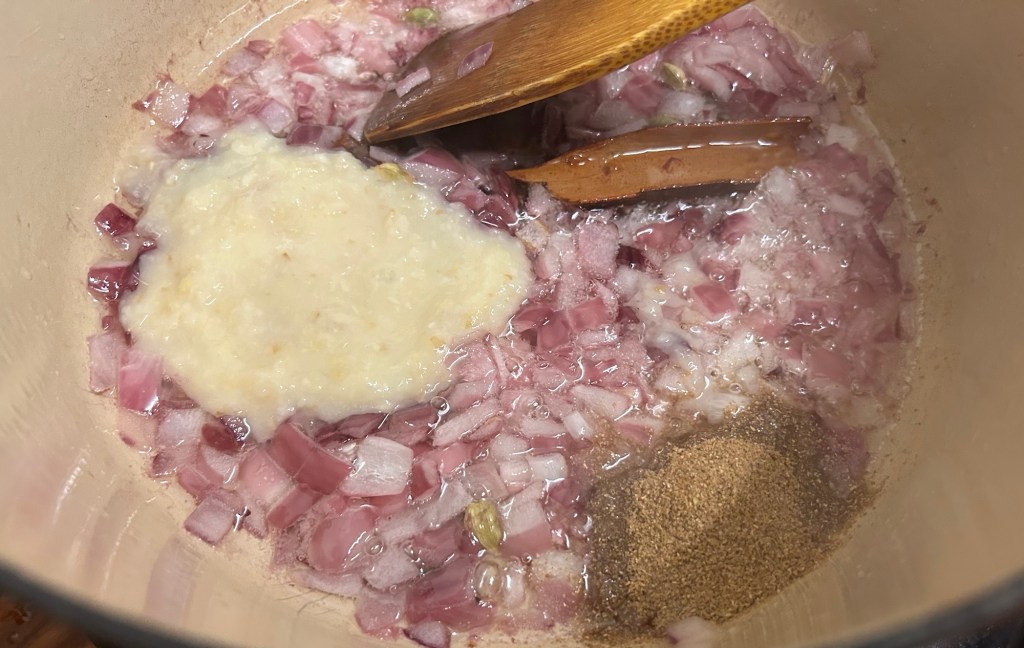 Add the ginger & garlic pasteâŚ..quickly followed by the ground coriander.