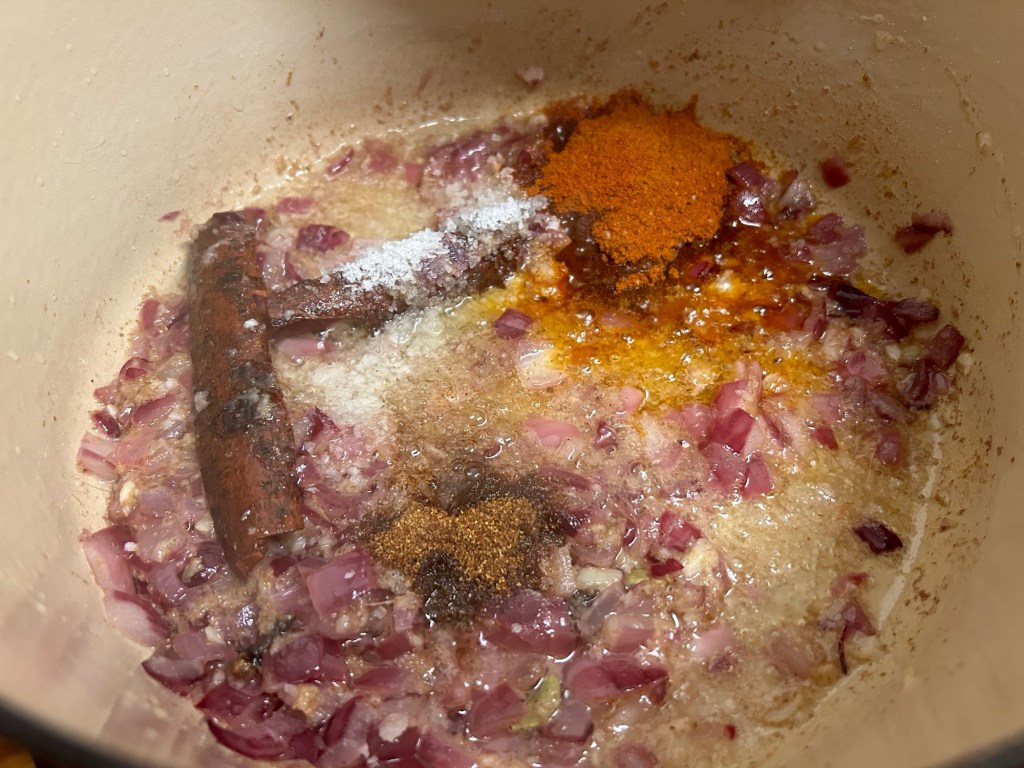 4 tbsp of rapeseed oil, 2 small cinnamon sticks, 6 cloves, 10 cardamom pods, 1 red onion finely diced, 1 heaped tbsp of garlic and ginger paste, 1 tbsp of ground coriander, 900g of stewing steak ( shoulder), 1 1/2 tsp of salt, 1 tsp of cayenne pepper, 2 tbsp of paprika and a large handful of coriander finely chopped.