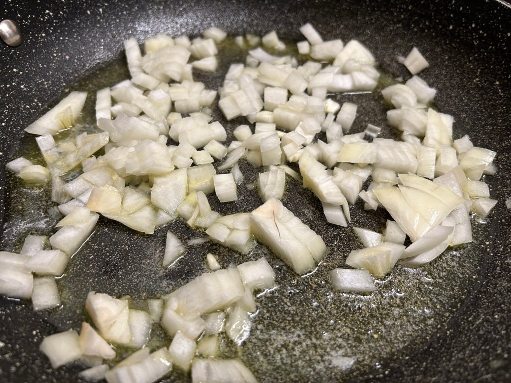 Once the butter has melted add in your diced onions and fry for 5/6 minutes until nice and translucent.