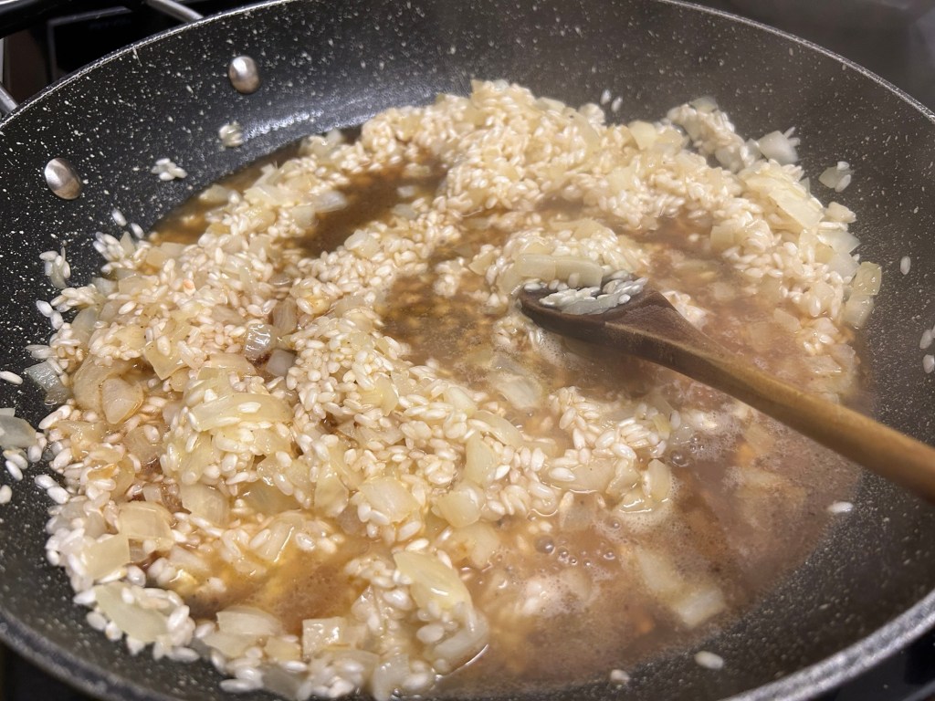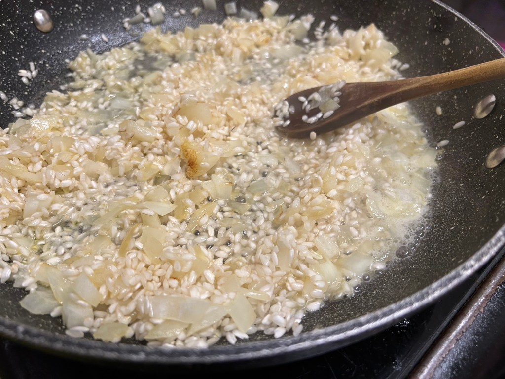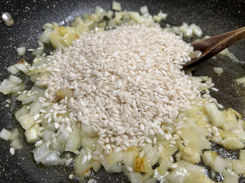 Add in your arborio rice. Stir around the pan coating the grains with the butter / onion mixture.